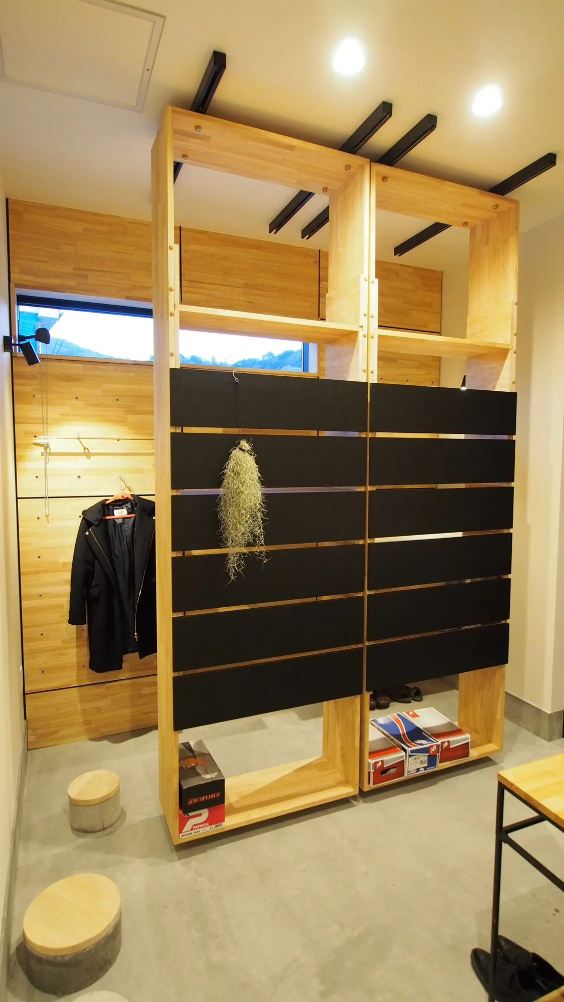 前後に可動するシューズクローク。固定壁には洋服、バッグ、傘などを掛けれる万能フック付き。圧迫感のない程よい目隠しで、ちょい見せ収納を。