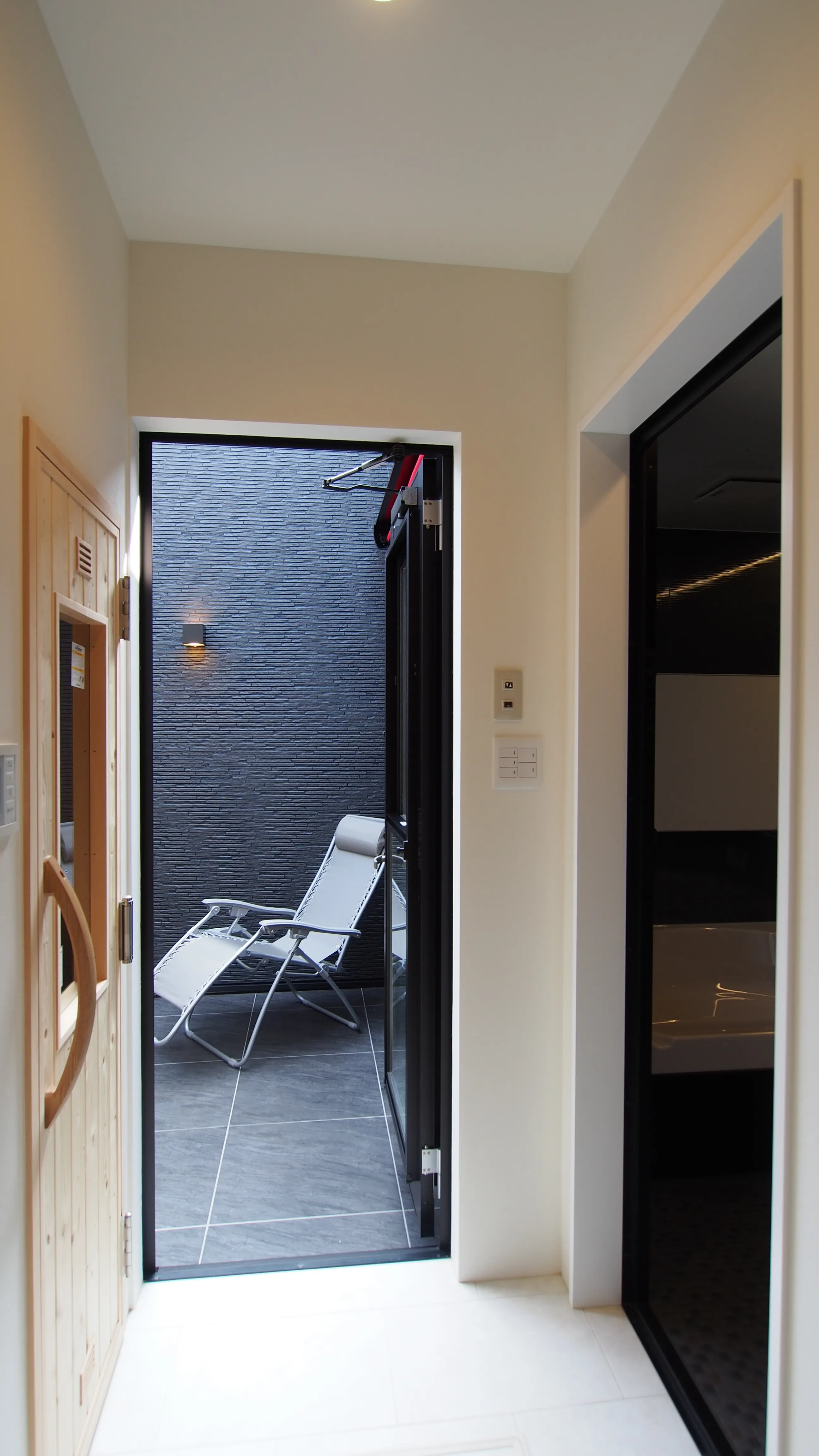 -バスルーム- サウナルームを備えたバスルーム。高い塀で囲まれたプライベートテラスには人目を気にせずラフに出られ、のんびりと優雅なバスタイムを過ごすことができる。