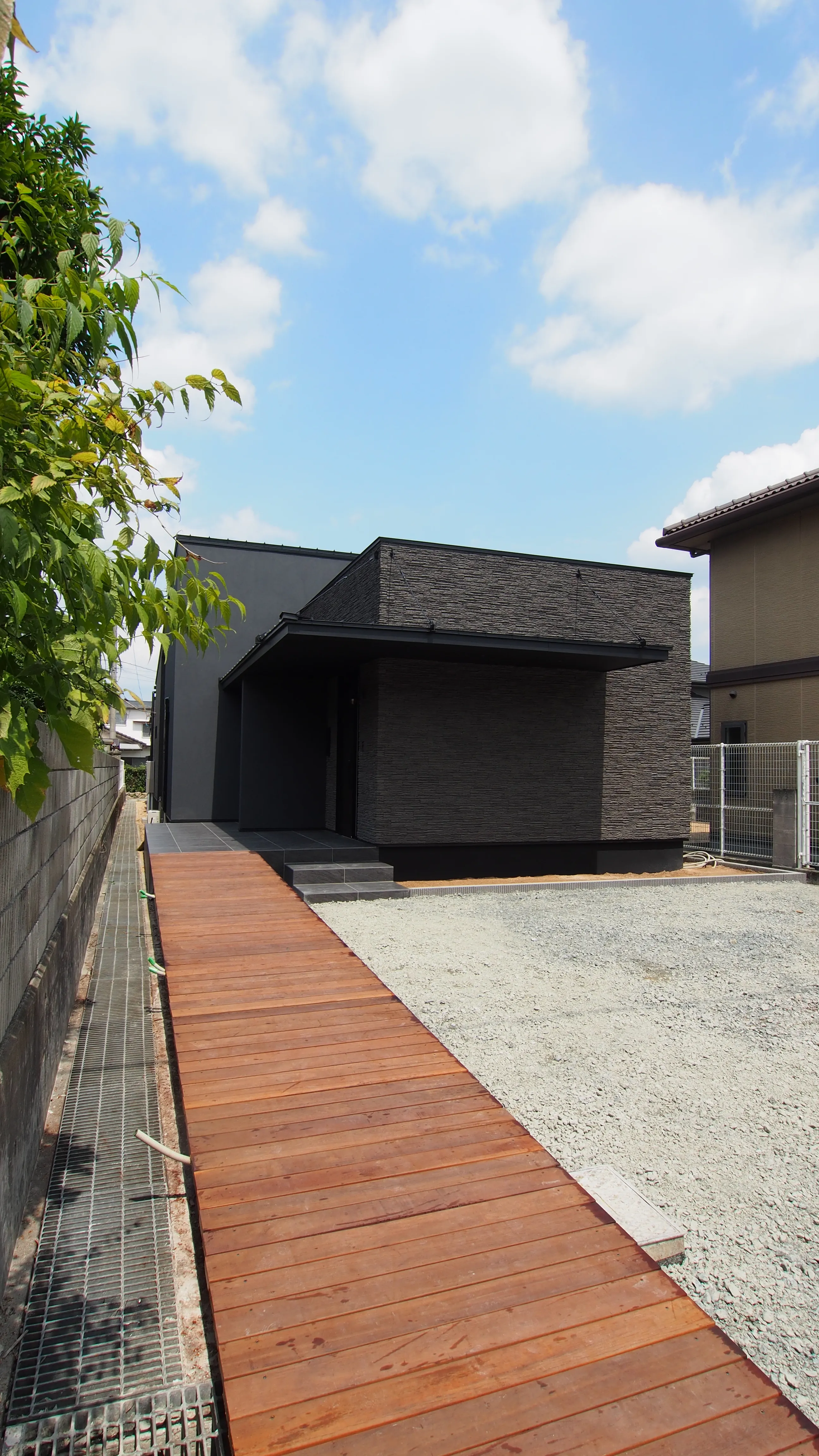 -スロープ- 長いスロープが美しく、玄関奥の自転車やベビーカーなどが止められるスペースへつづく。どんなシチュエーションでもエントランスへスムーズにアクセスできるよう配慮。