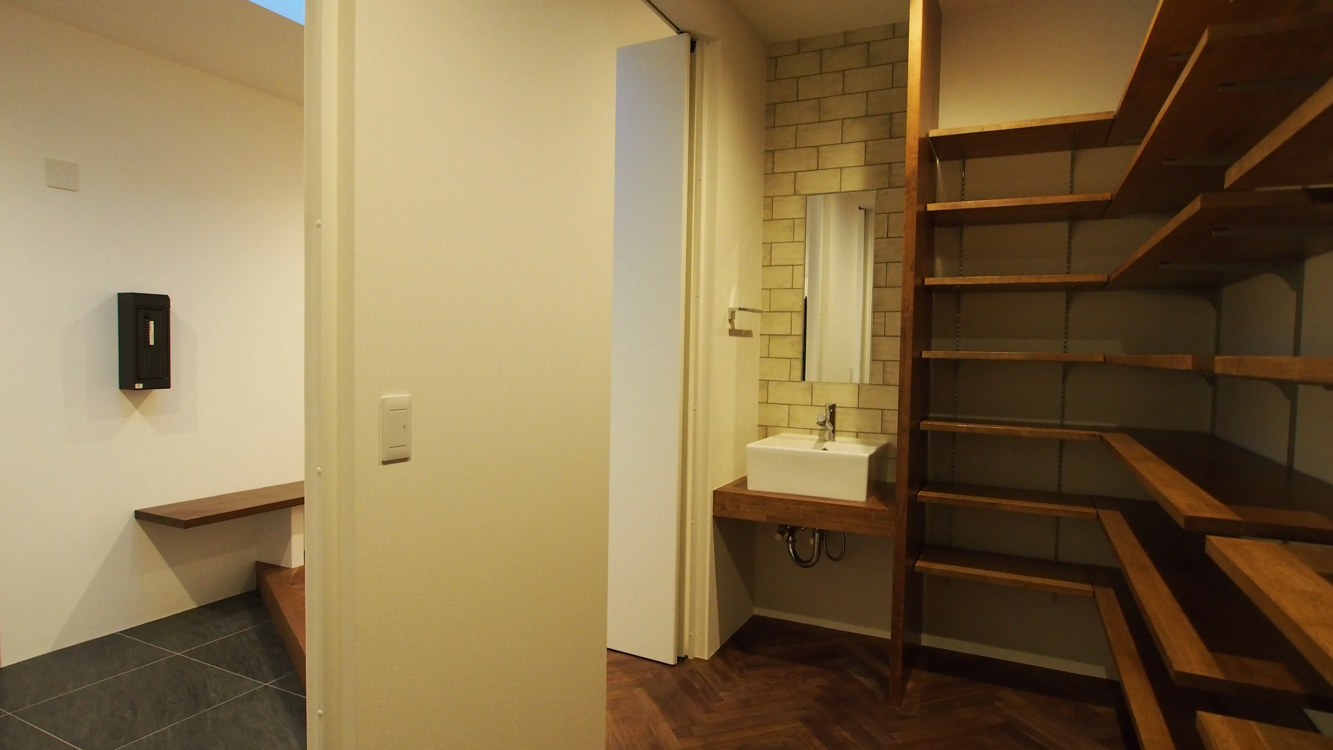 -クローク- 玄関の傍らにある大きなクローク。家族は玄関からこのクロークを通ることで、玄関を美しく保つことができる。備え付けられた洗面コーナーで手洗いを済ませることができる嬉しい動線。