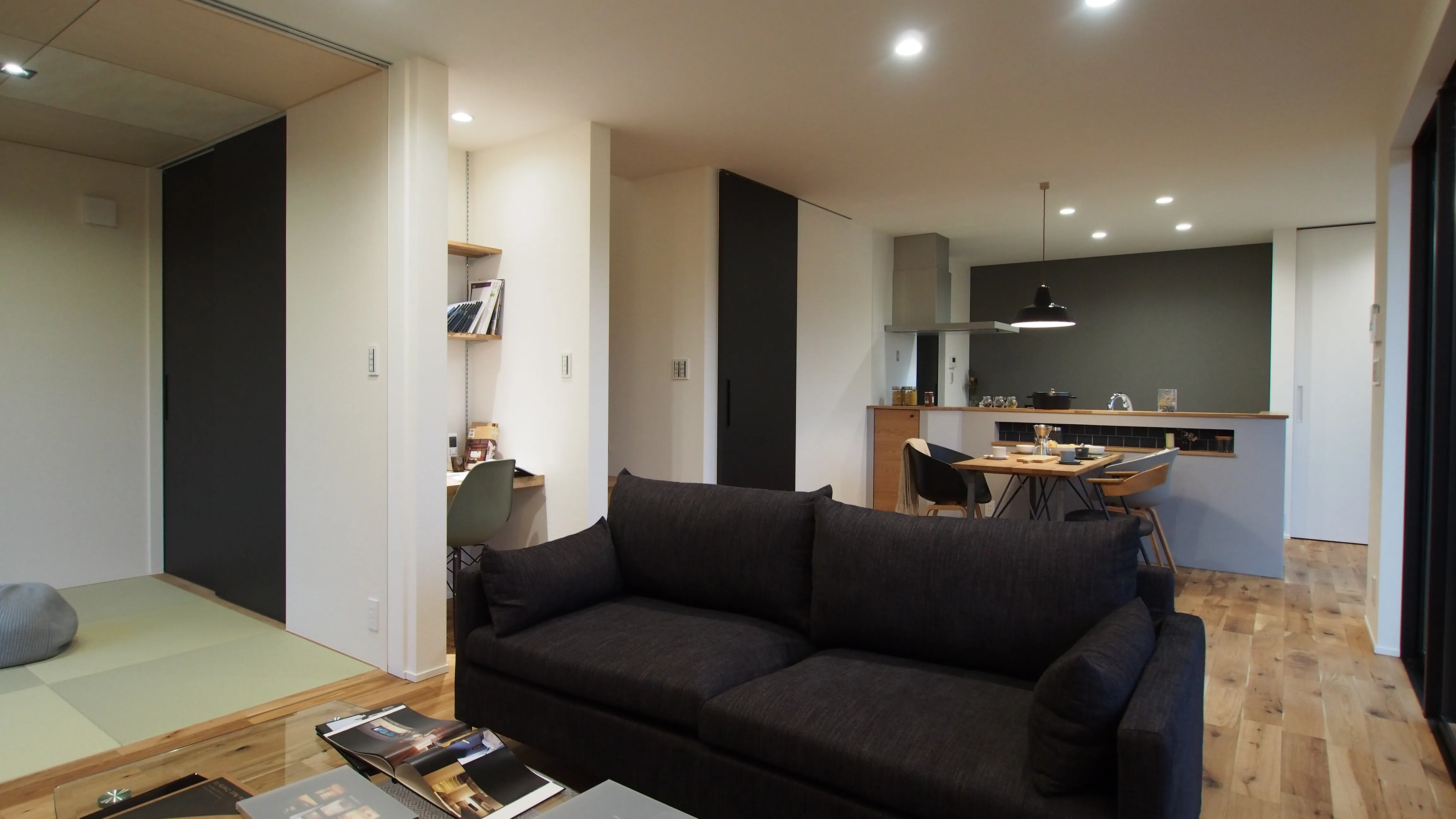 リビングの天井は高く、空を切り取った高窓から優しい光が差し込むLDKにはスタディコーナーを設け、一つの空間で家族がそれぞれの時間を快適に過ごせるよう計画。