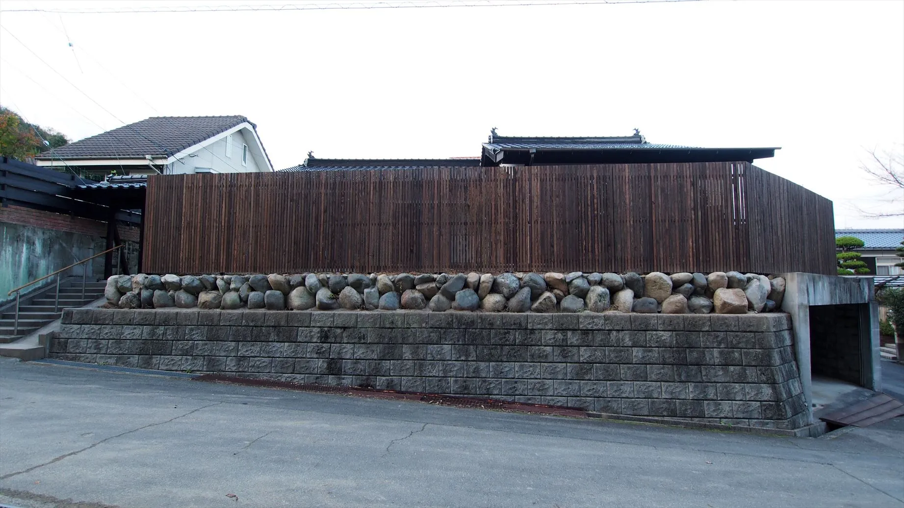 - 外装 - 堀車庫の上に立つ古家。石垣の上に目の細かい格子を築き、視線を遮り、凛とした佇まいに。
