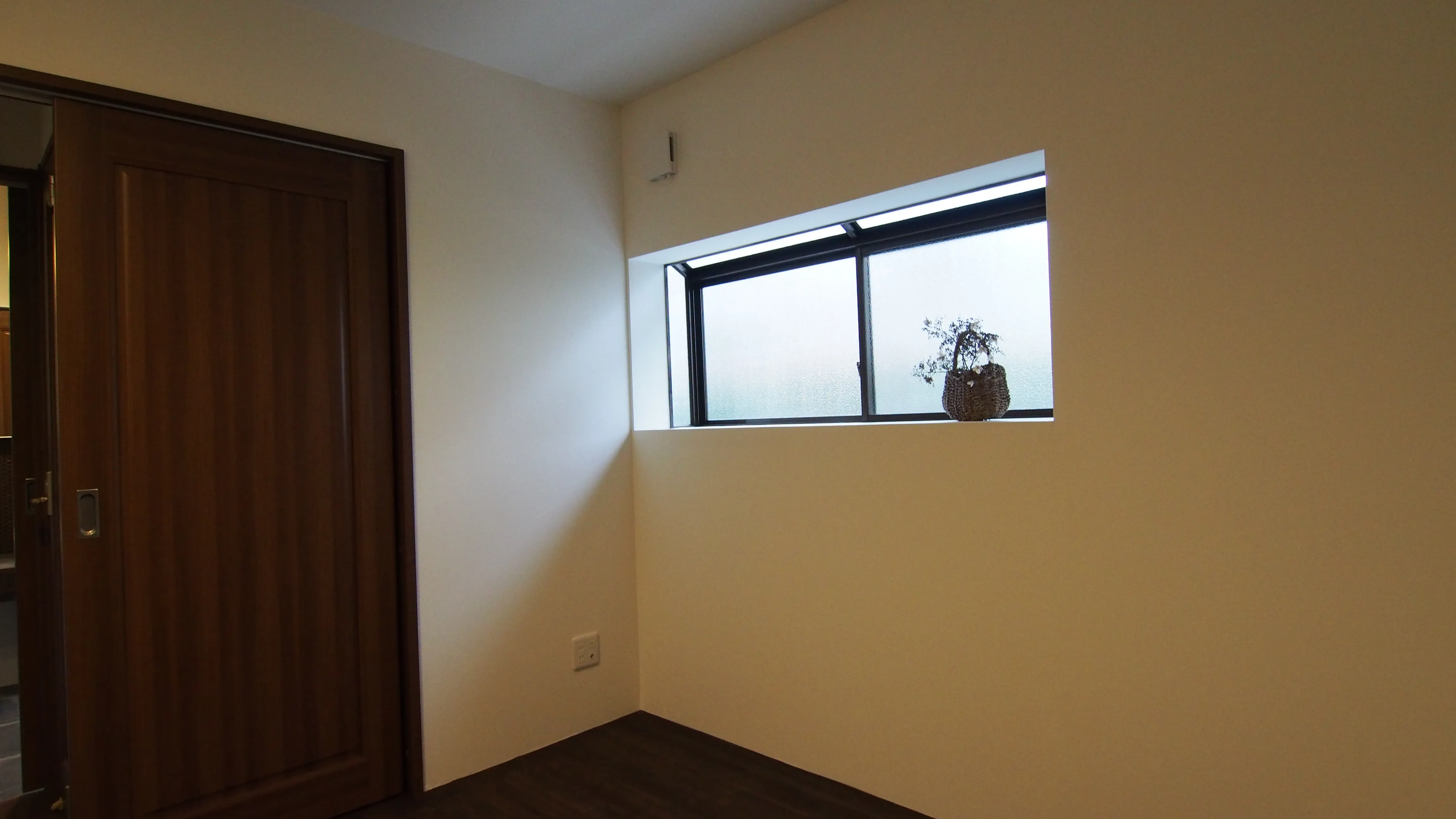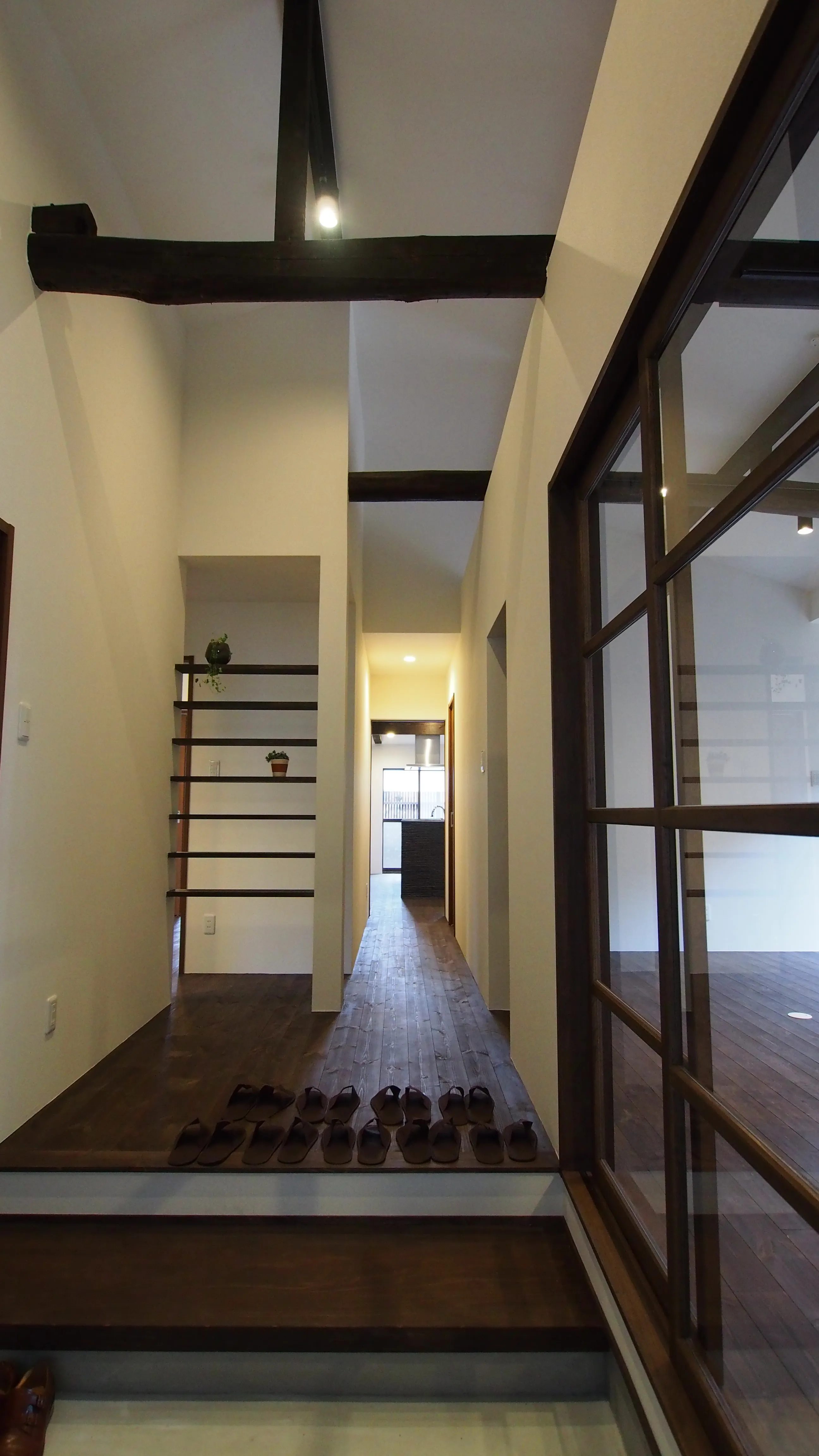 - エントランス - 玄関からの来客をすぐに迎えられるようデザインしたオフィス。見た目も美しいガラス戸をオーダー。土間を2方向に振り分け、来客を誘導する。