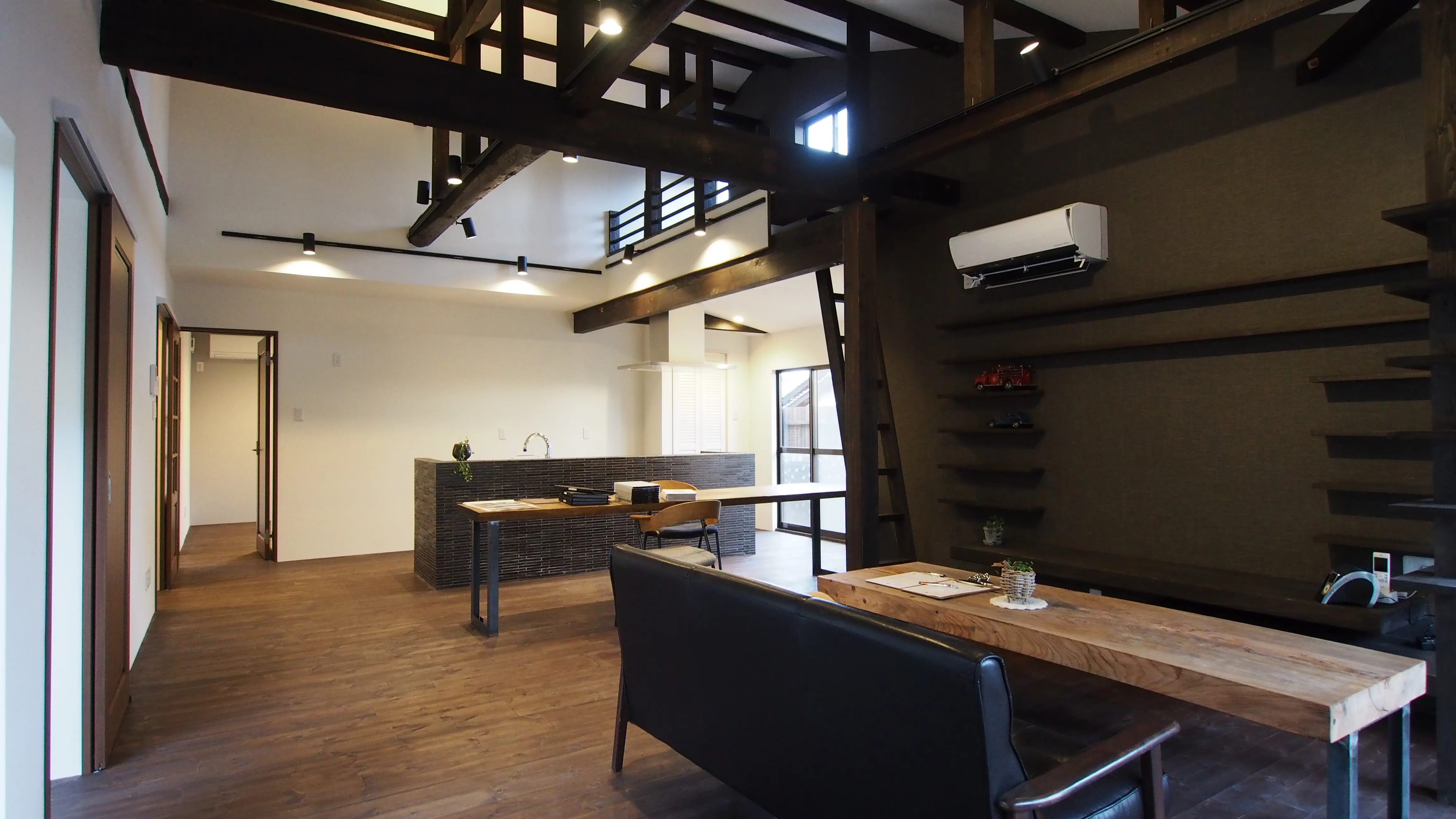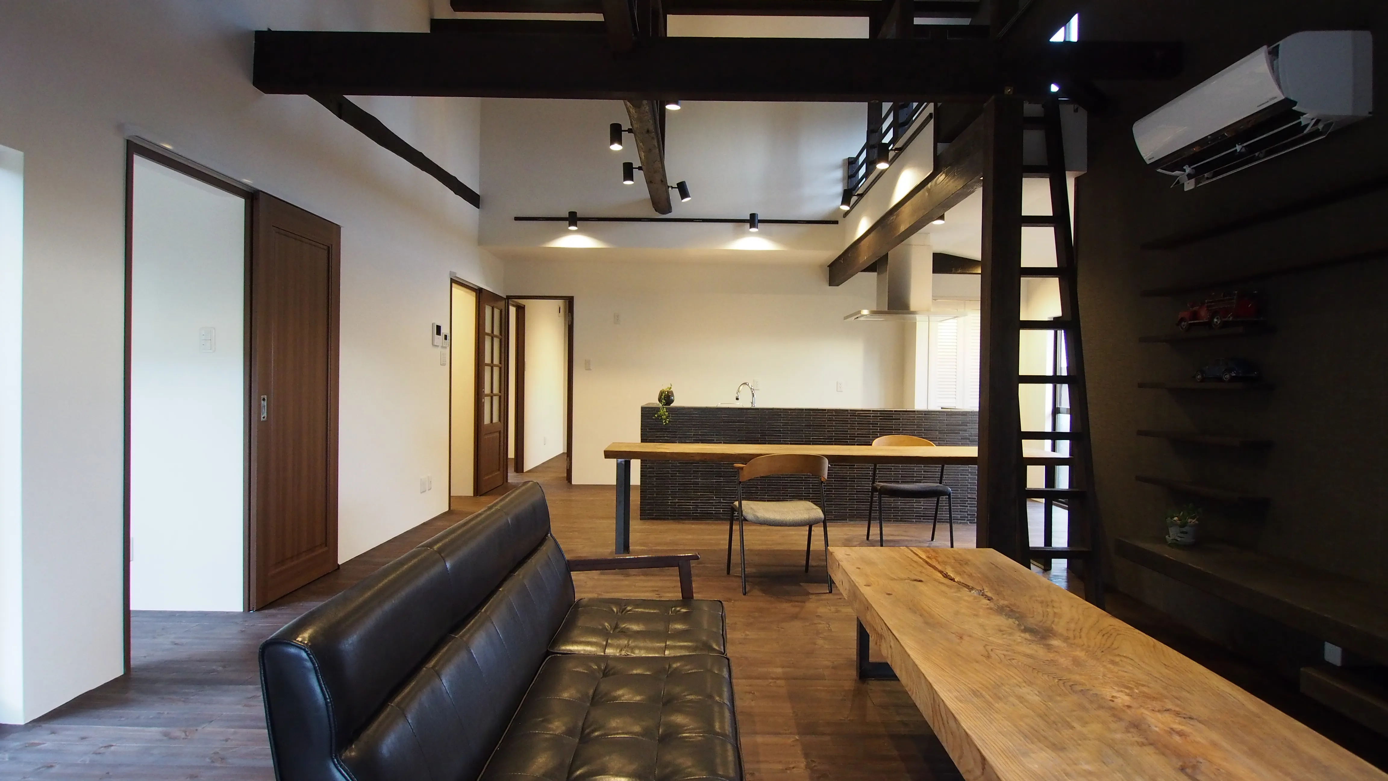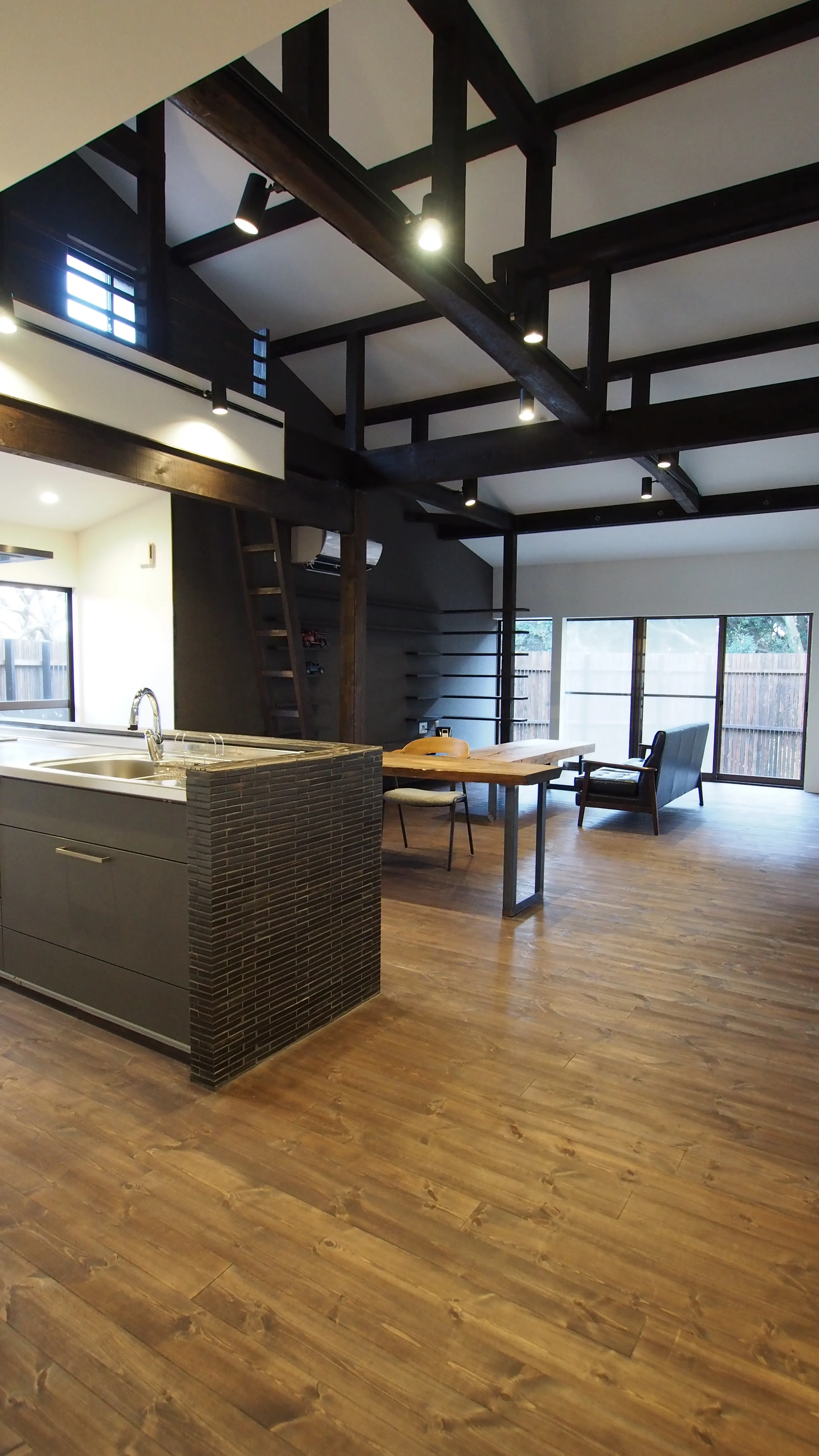 - リビングダイニング - 2階部分を大きく取り除き、美しい梁を現しにし、一部をロフトとして残し、たての空間をデザイン。