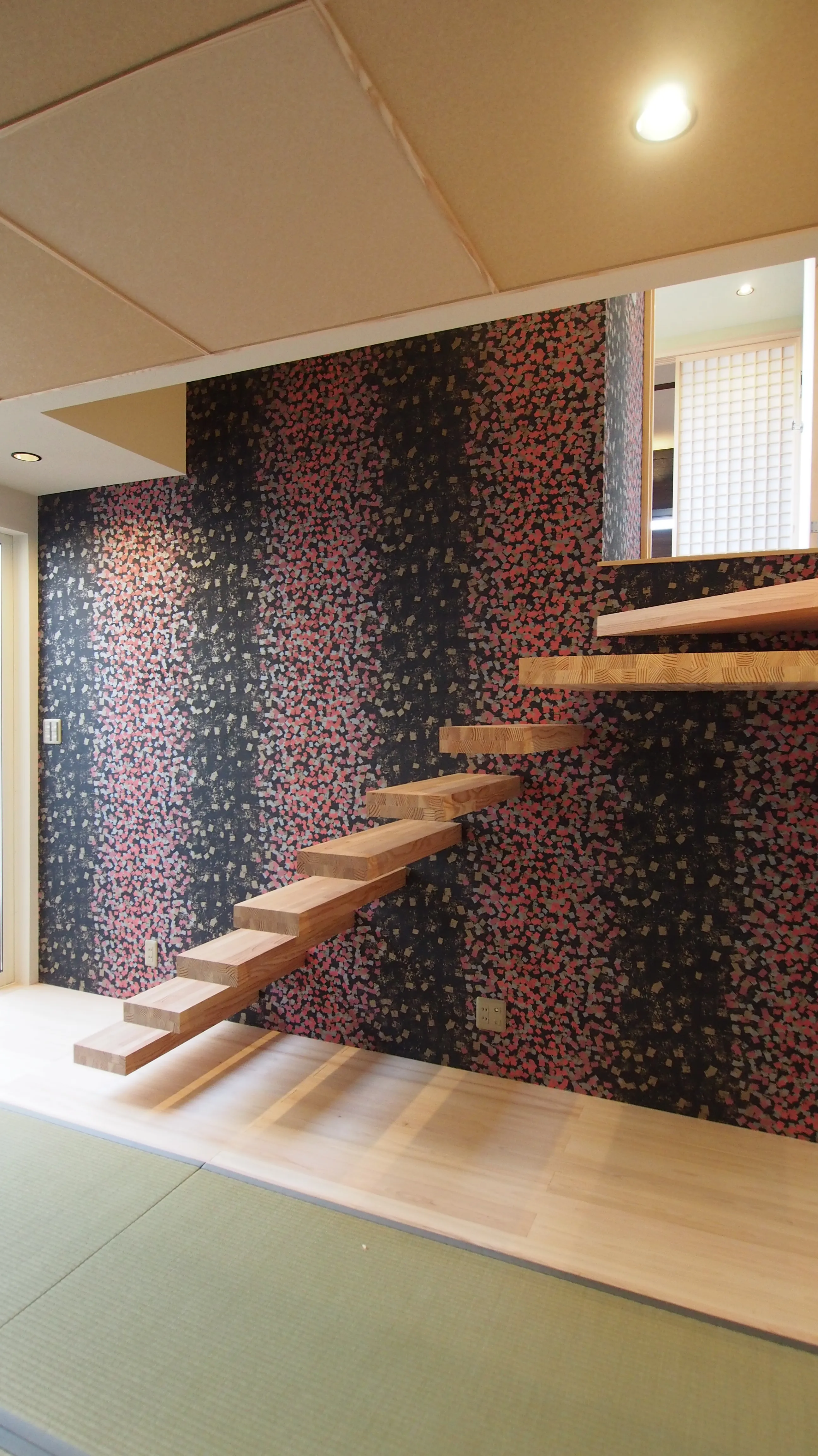 -不思議な空間- リビングの和室から続くフローティな階段。 地下に降りていくような感覚で、1階の和室へとつながる。