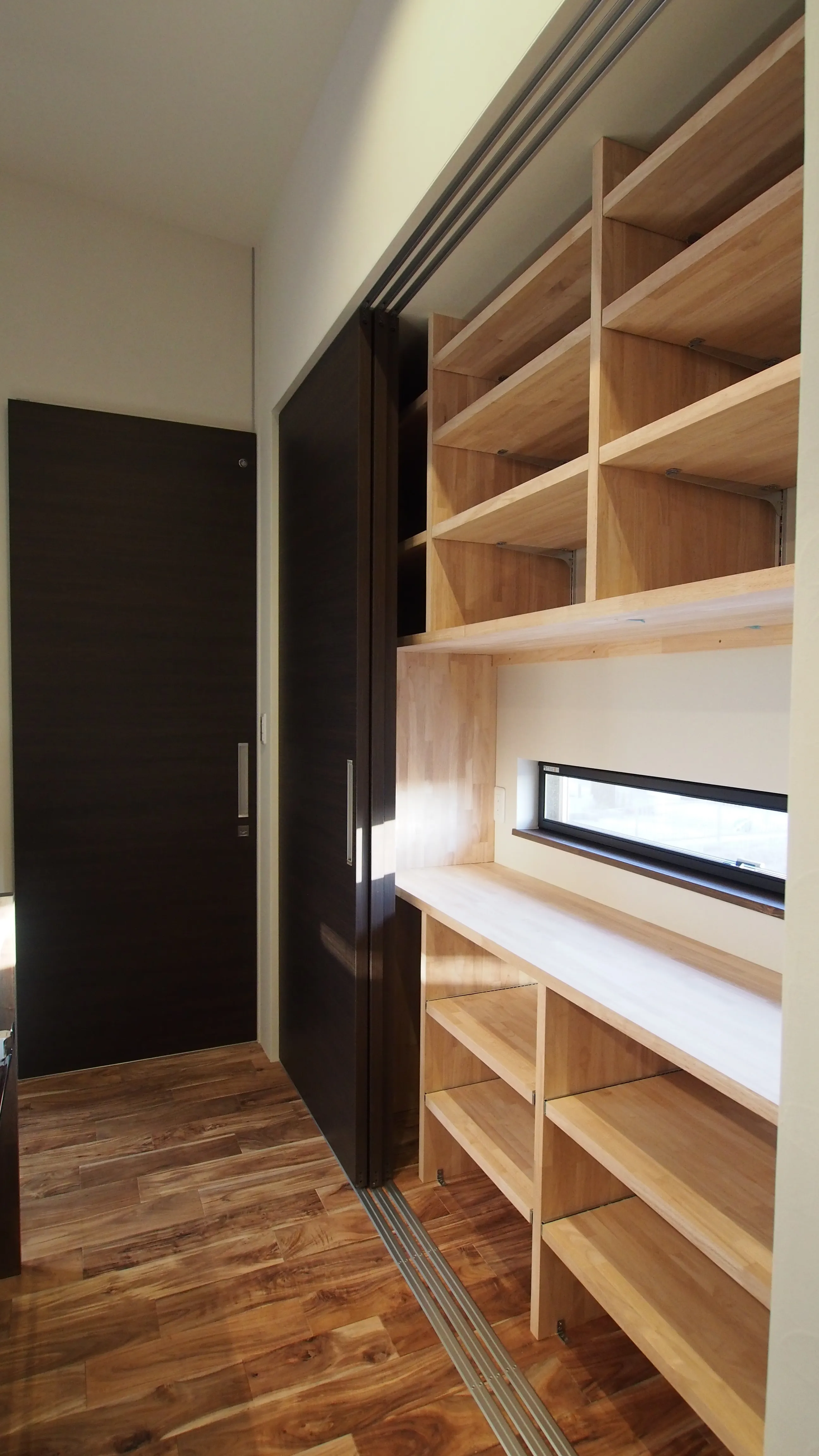 -キッチン収納- 日頃はオープンで明るく機能的なキッチン収納。 扉を閉めるとキッチンのいろいろをすべて隠してしまえる、ありがたい収納。