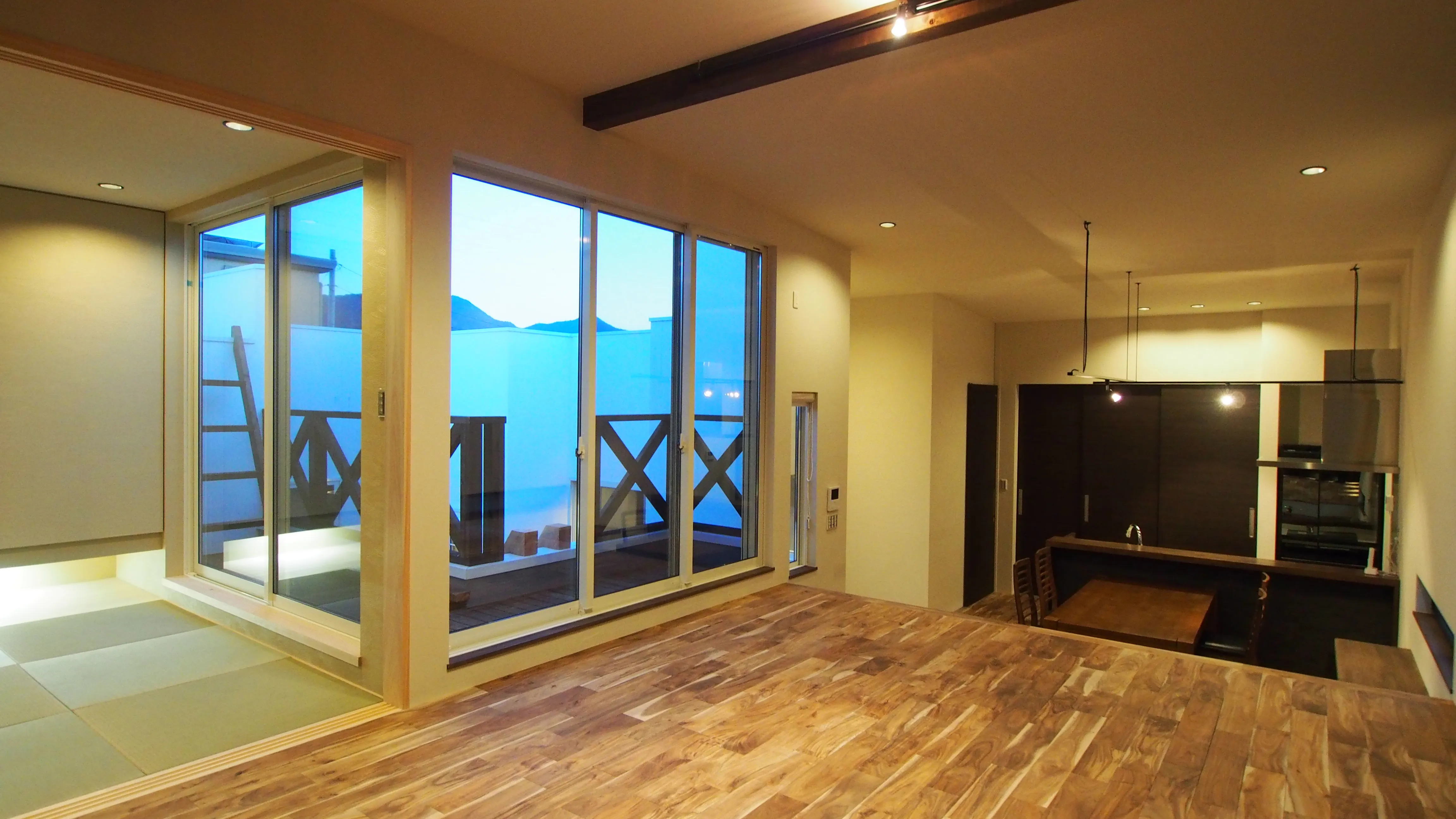 -中庭バルコニー- リビングの外には、中庭を見下ろすデッキのバルコニー。外部から視線を気にすることなく、気ままに過ごせるリビングが実現。