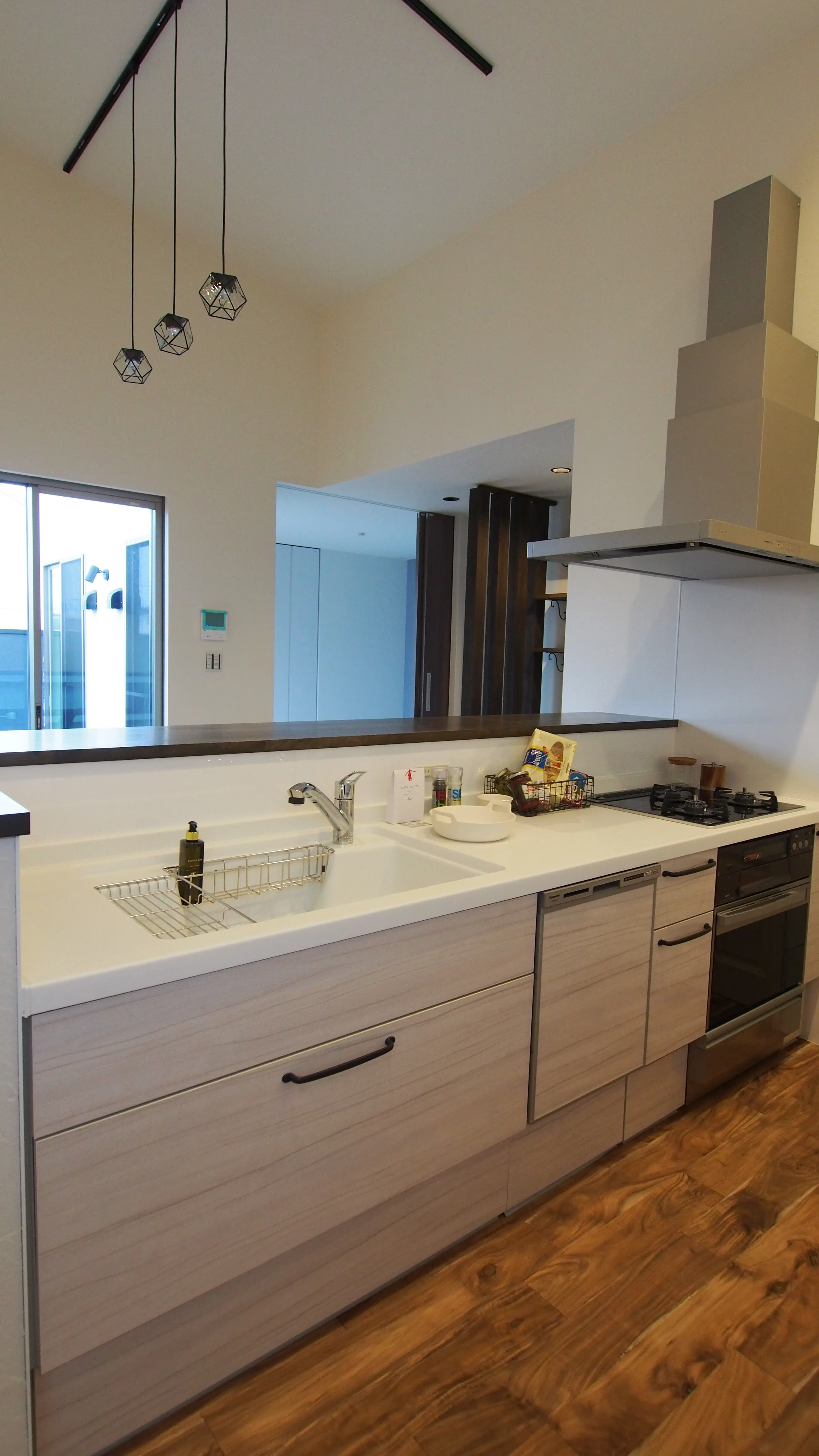 -ワイドビューキッチン- プライベートガーデンの先に空を眺められ、清々しい気持ちになれるキッチン。 忙しい日々の中でも、子どもたちの様子を感じることができるママ想いの設計。