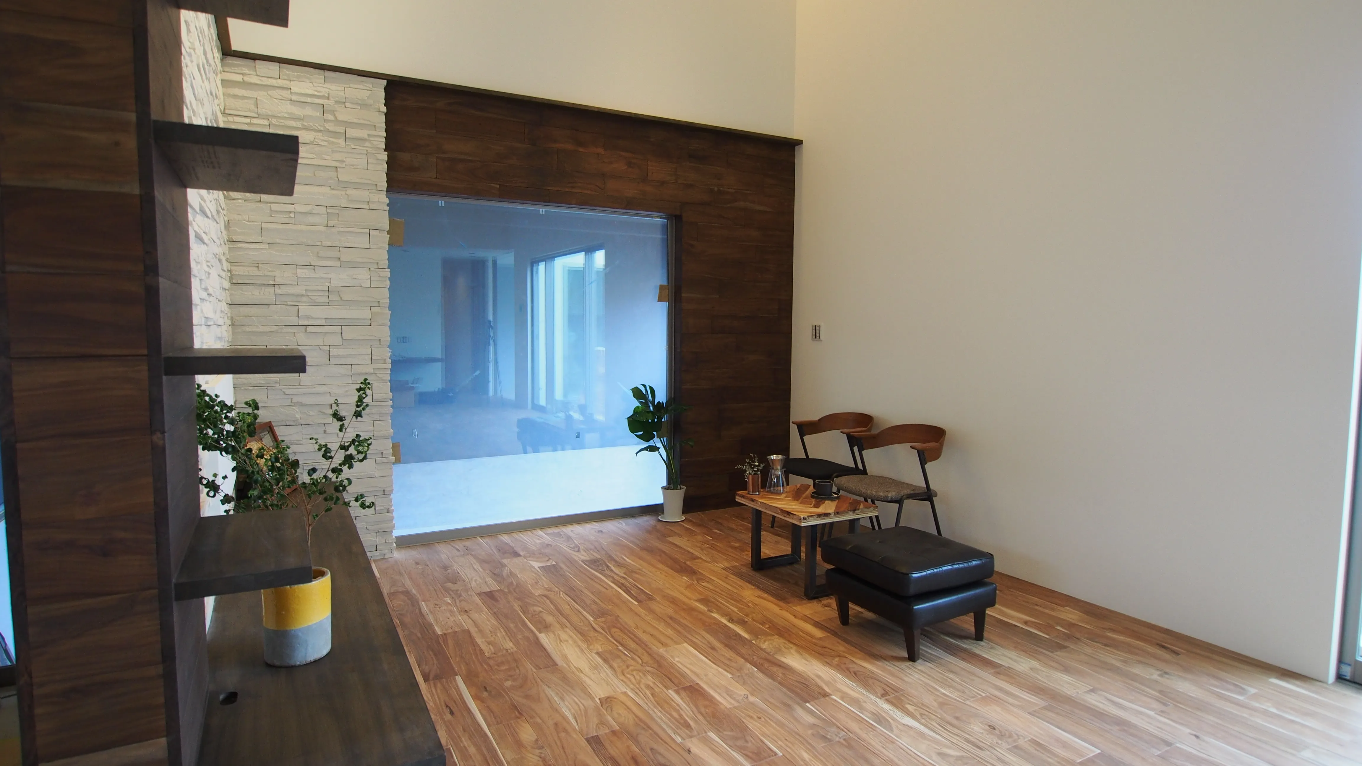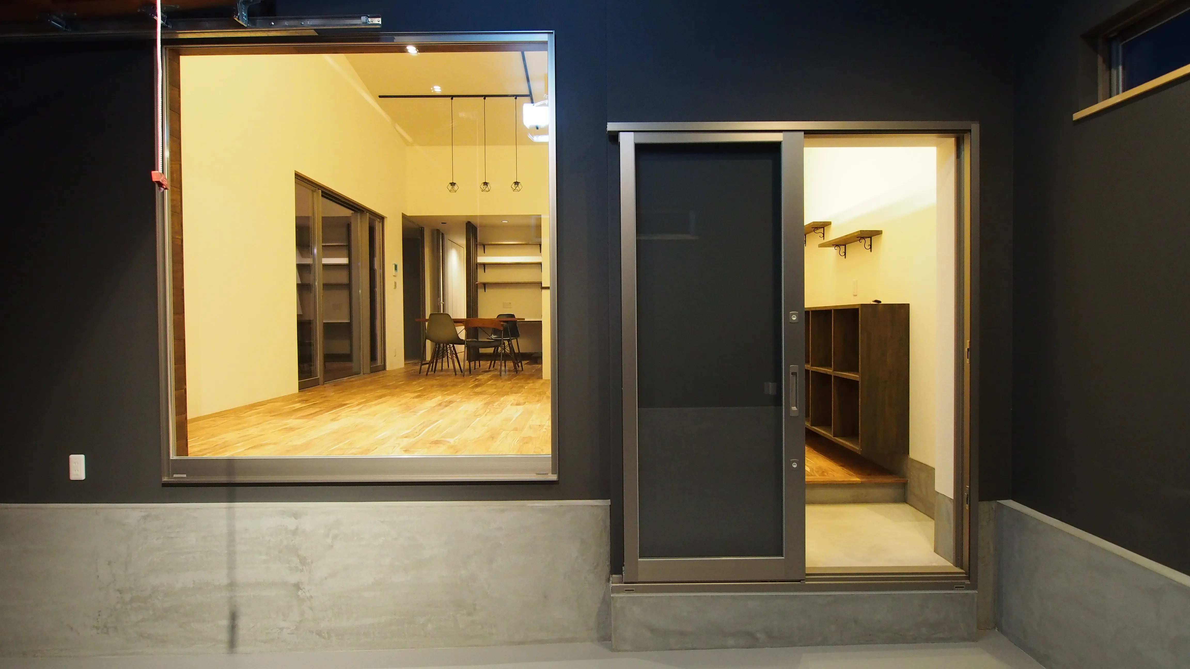 -ガレージ- ガラス一枚先のLDK。 ガレージの作業中にもLDKの家族を近くに感じる設計。 LDKにつながる勝手口は通路でありながら、大容量の収納を兼ねるバックヤードとしてスタイリッシュな空間を支える。