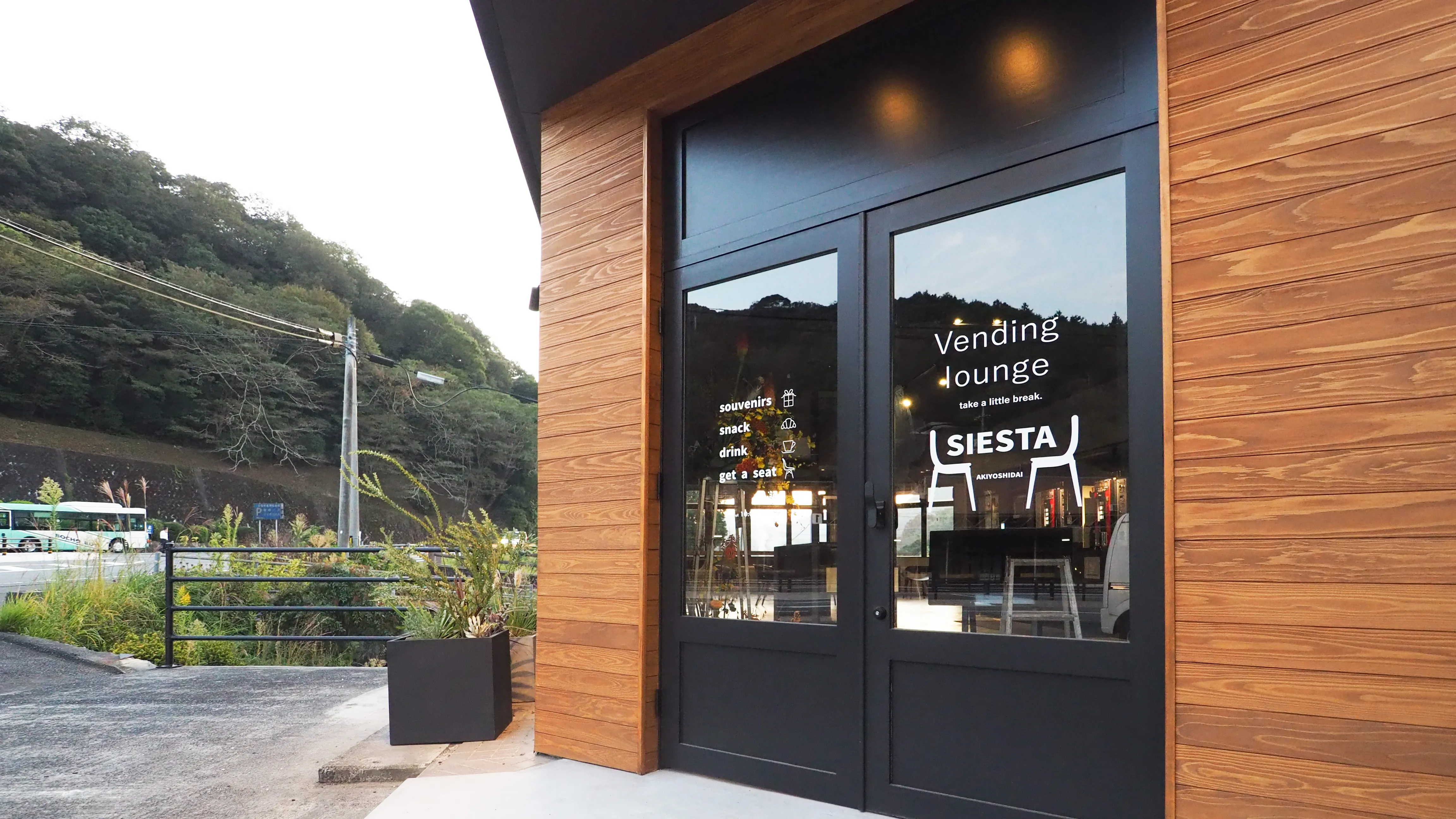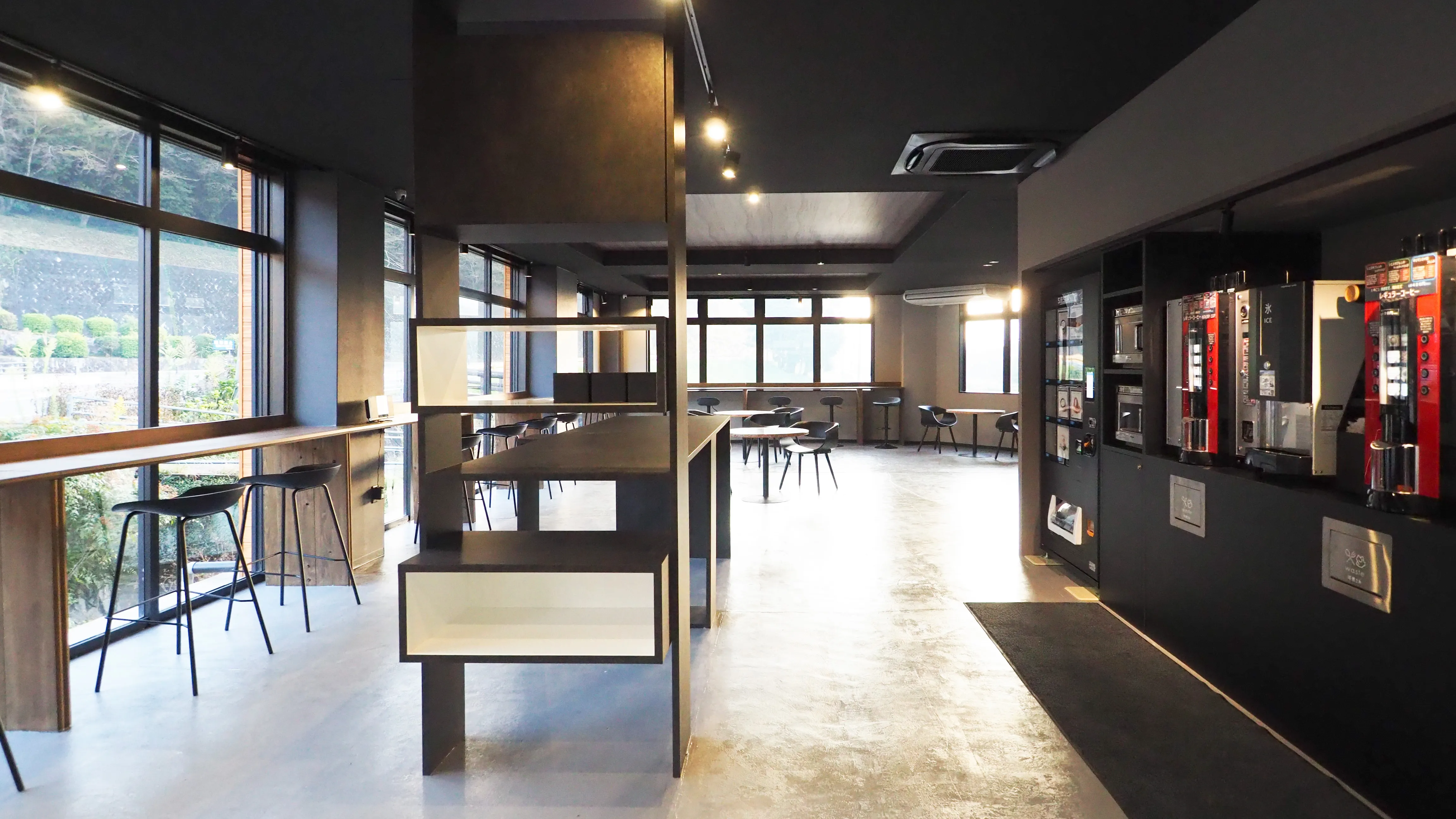 メインストリートから店内の様子が伺える、大きな窓。 中央にマシンを集め、迫力あるカフェカウンターを演出。 異なるシーンを想定して、いくつかの形式でテーブルを配置しました。 美祢市秋芳町の秋芳洞近くのお店を改装し、カフェラウンジが完成しました。 地元の魅力的な商品や全国から選りすぐりの逸品を取り扱うカフェです。