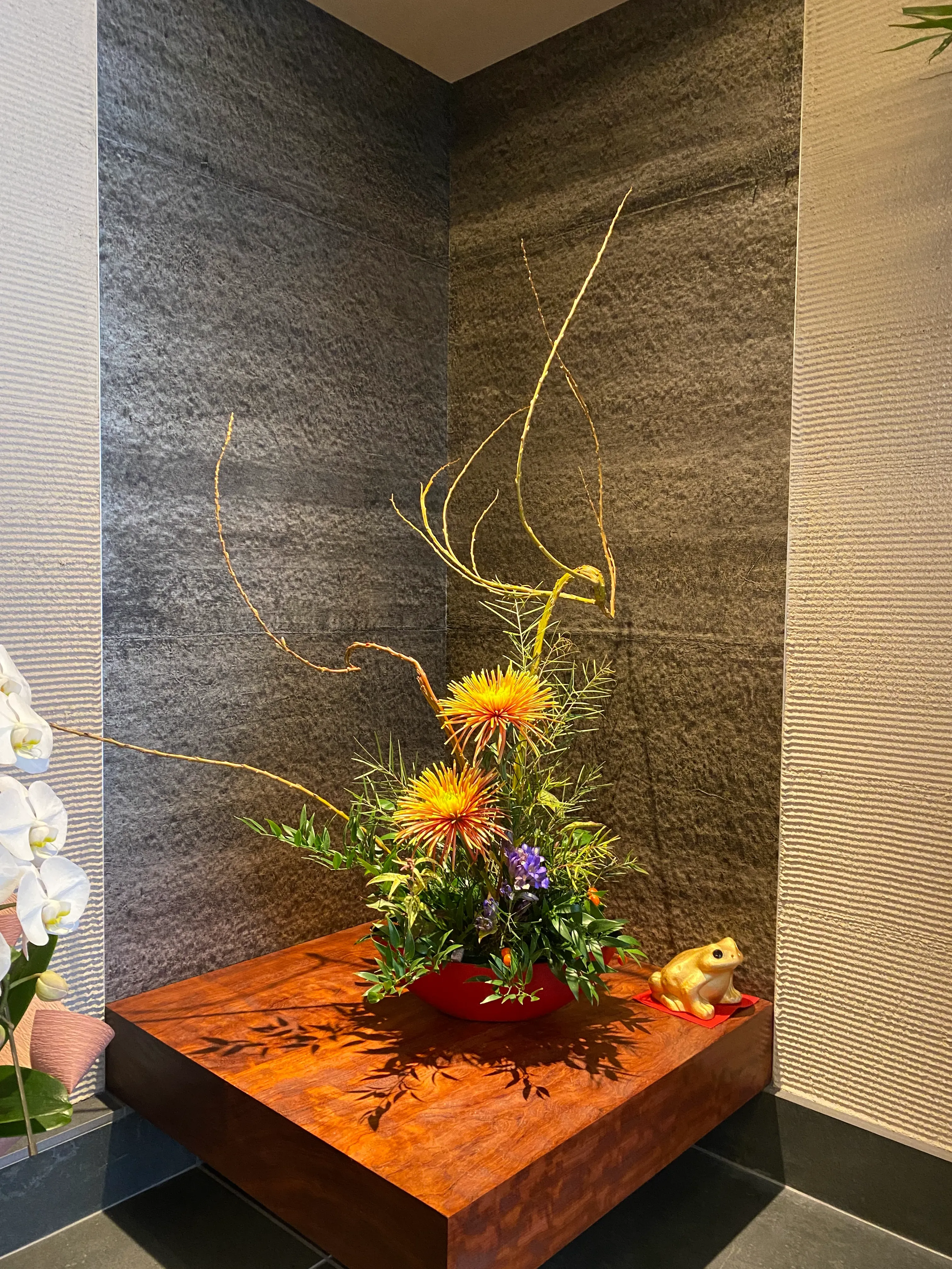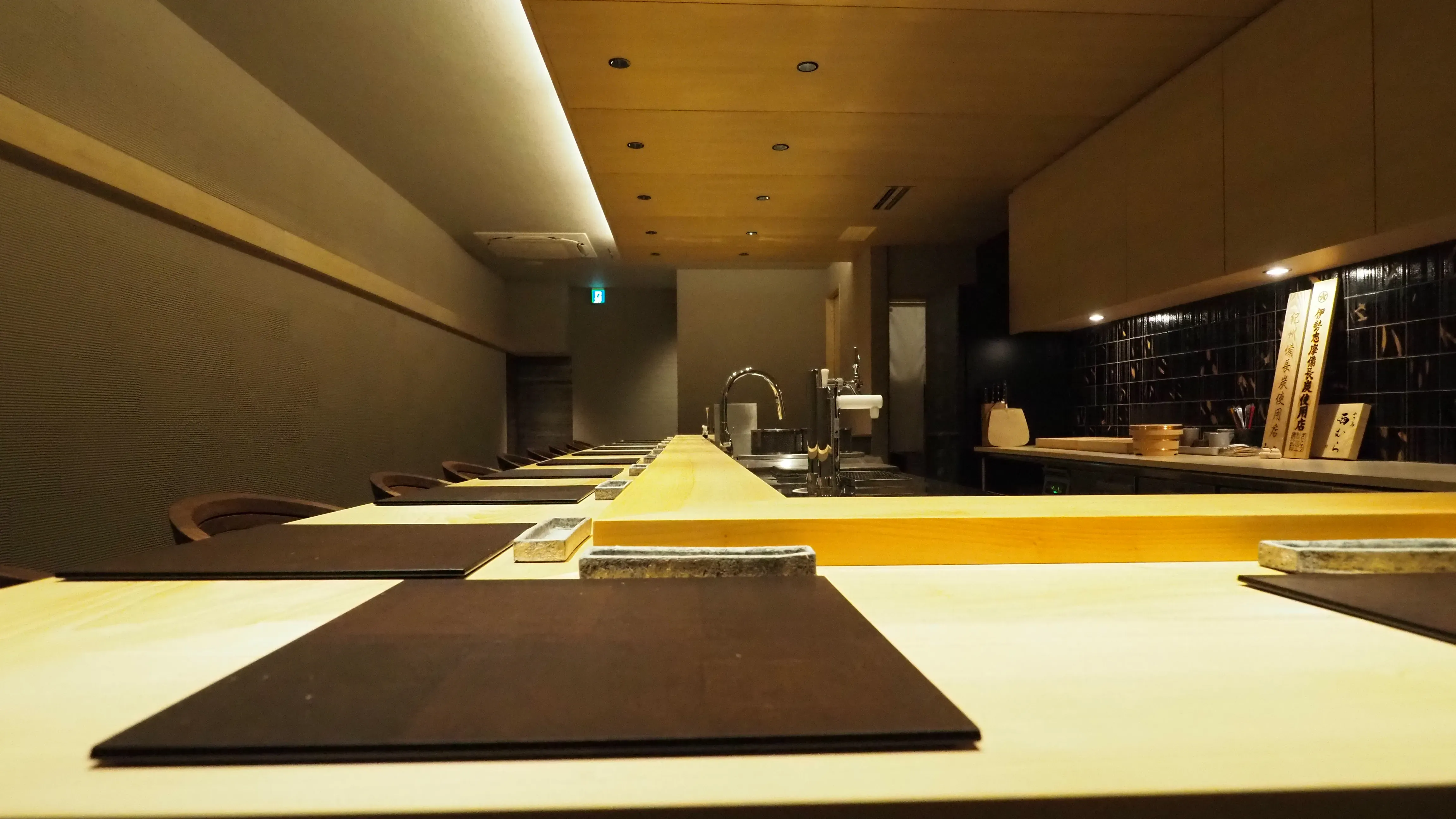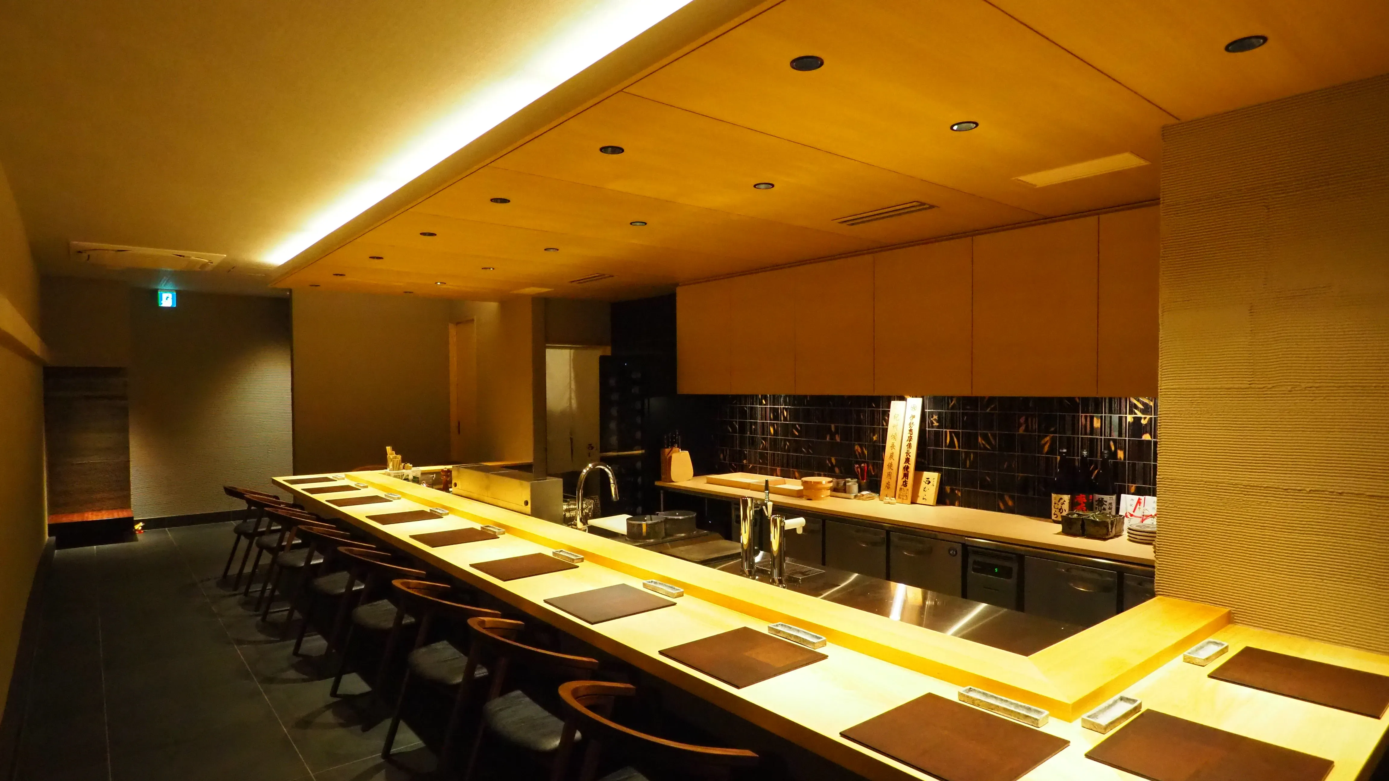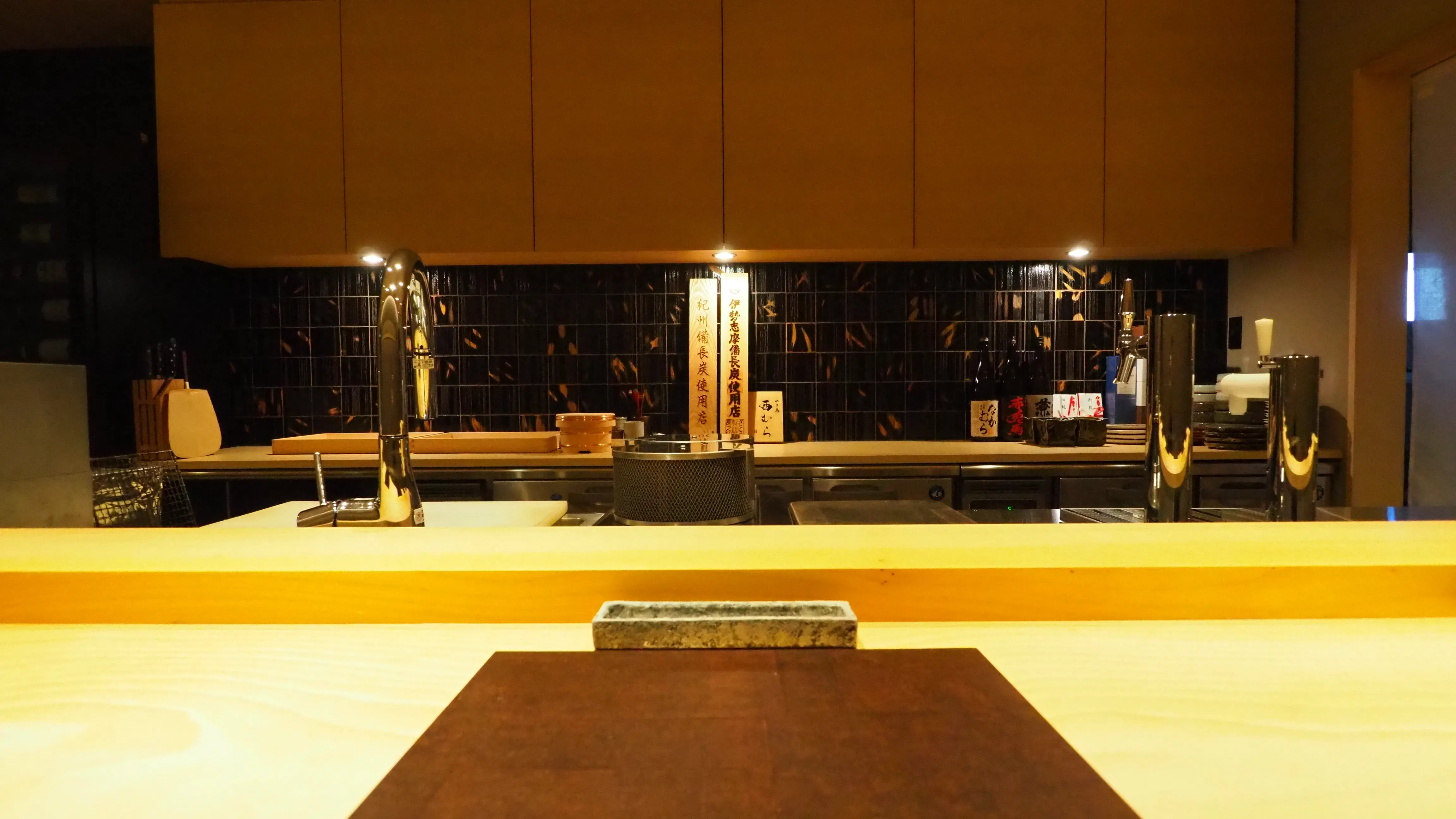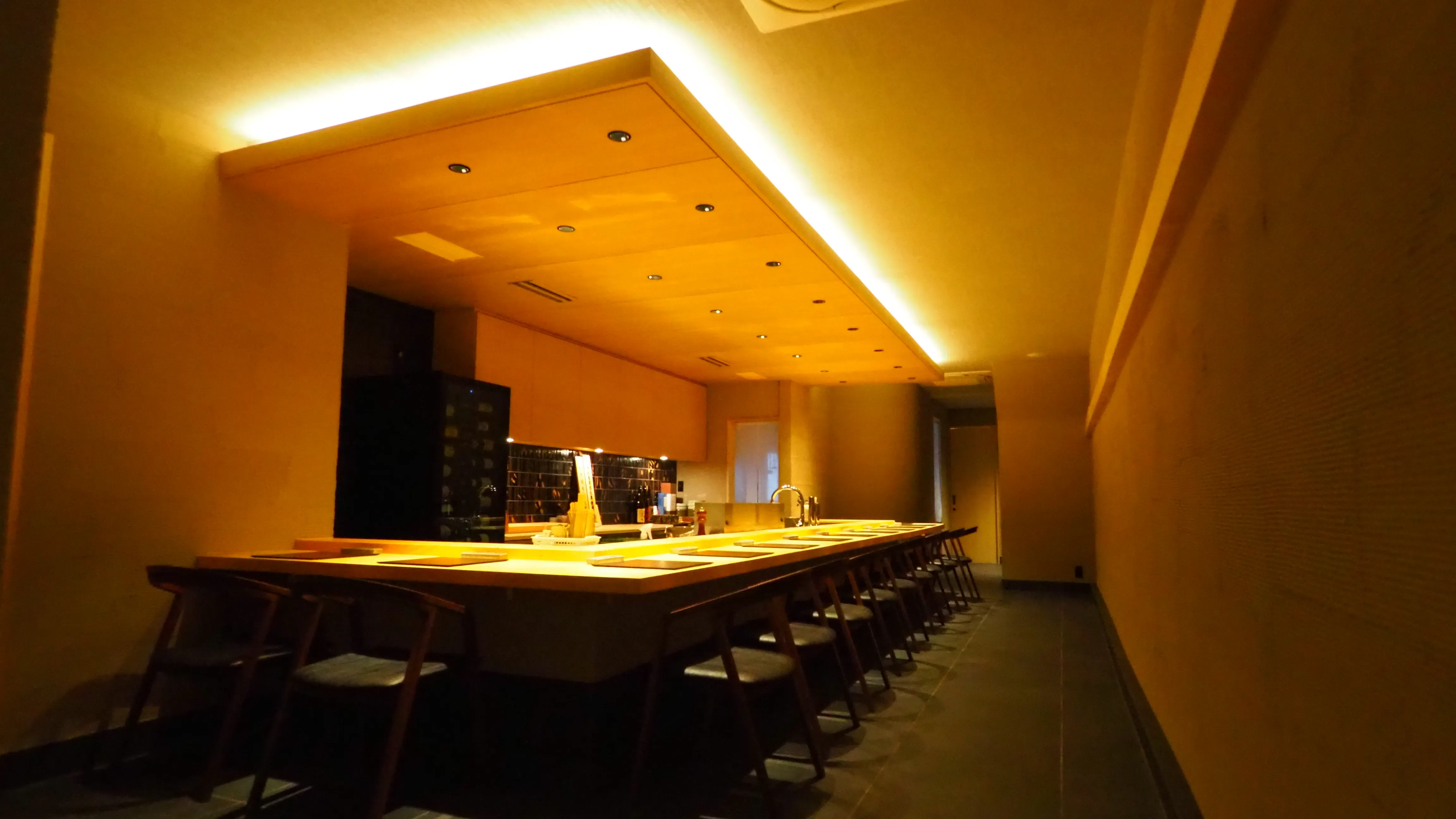 いちょうの木が醸し出す、上品に彩るカウンター。 下がり天井から溢れ出すひかりが、より空間をあざやかに演出します。 黒を基調にしたタイル。 統一されたシックでシンプルなおもむきは調和を作り上げます。