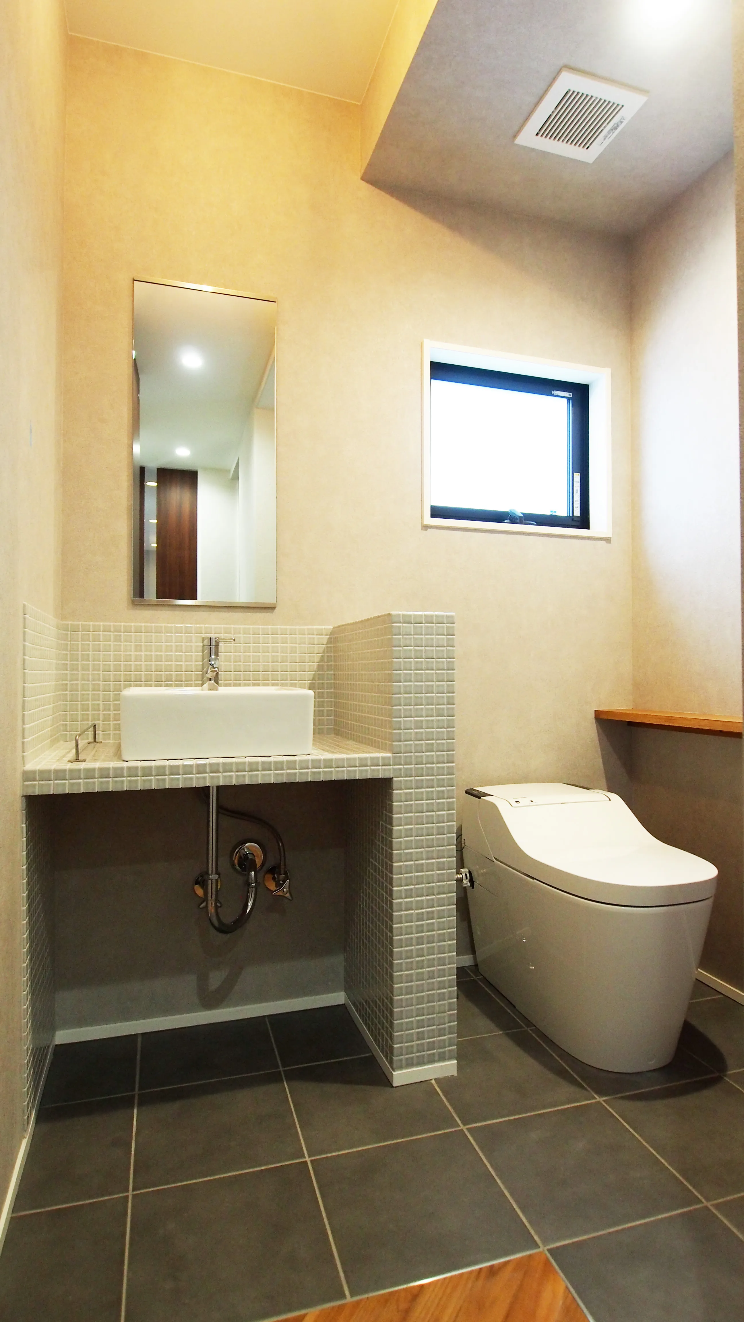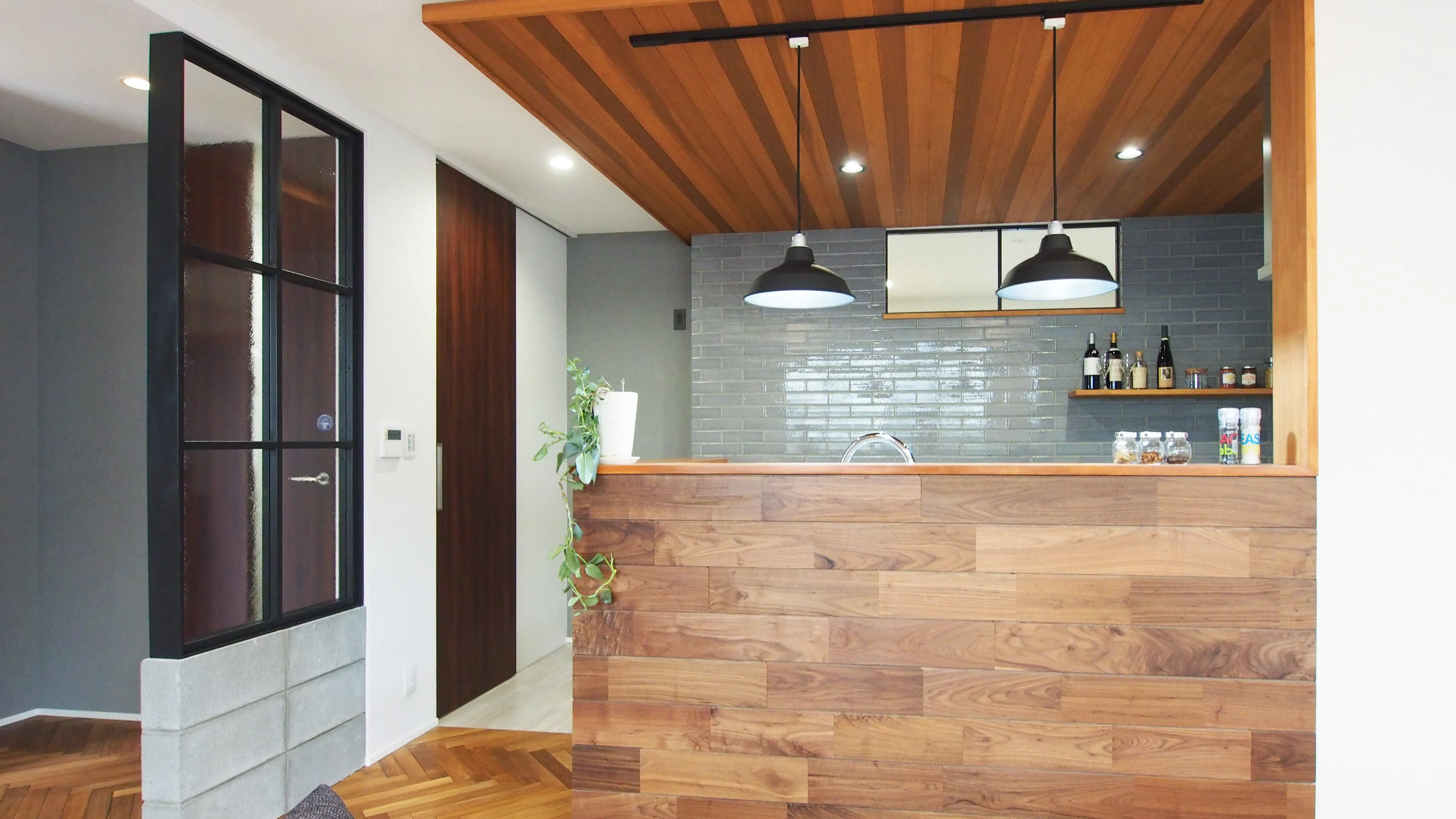 無垢フローリングは異なるパターンでデザインを愉しみ、タイルやコンクリートブロック、アイアン、デザインガラスなど大切に選んだマテリアルで構成された空間となった。