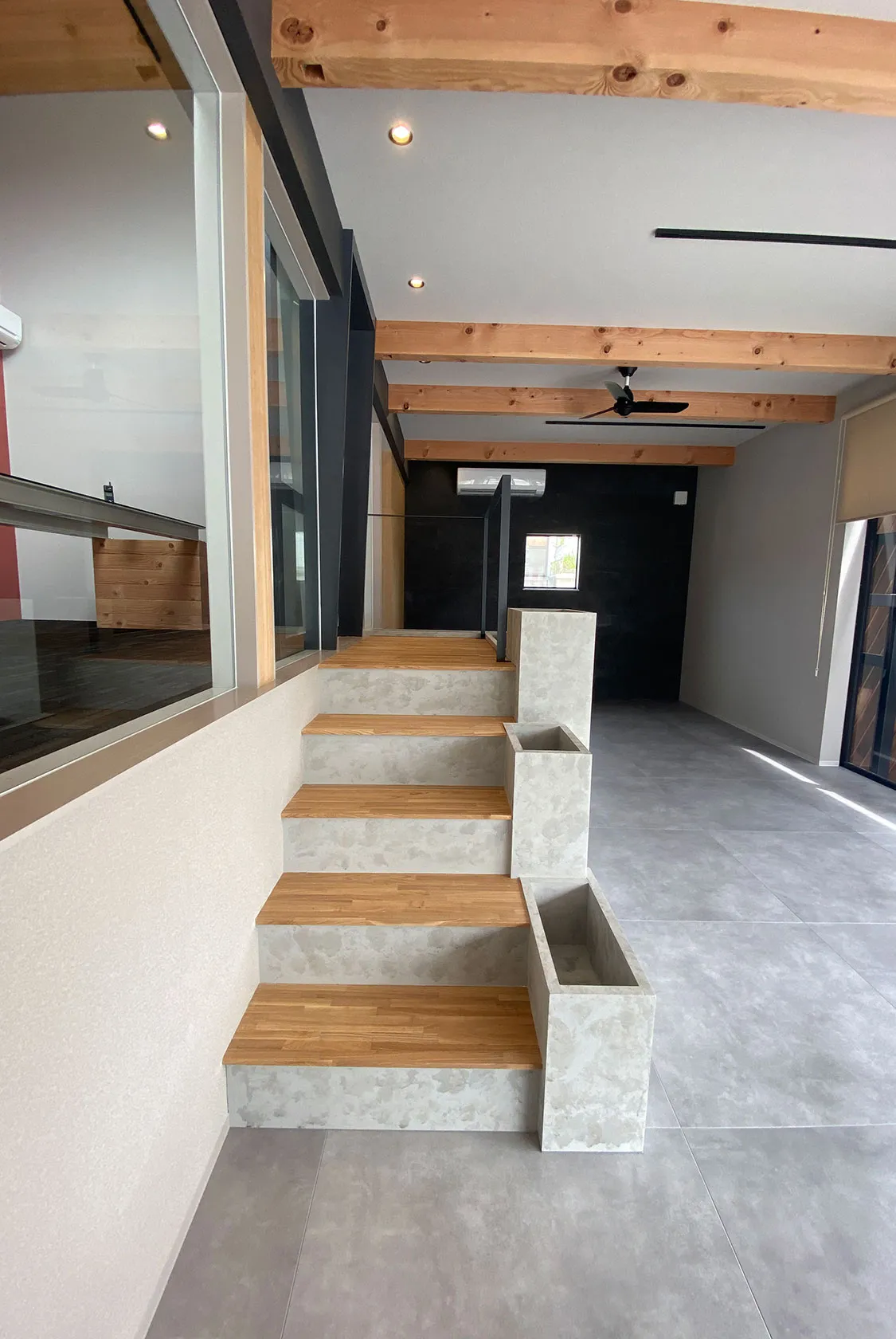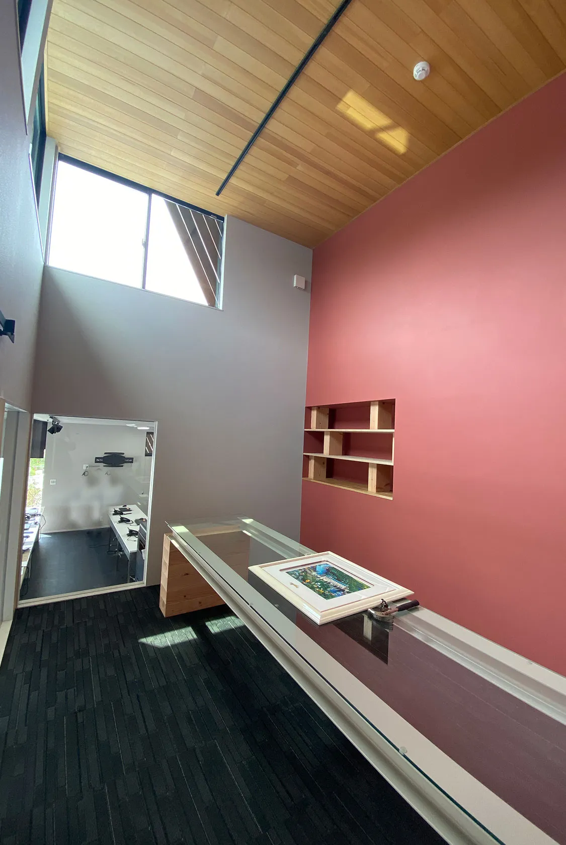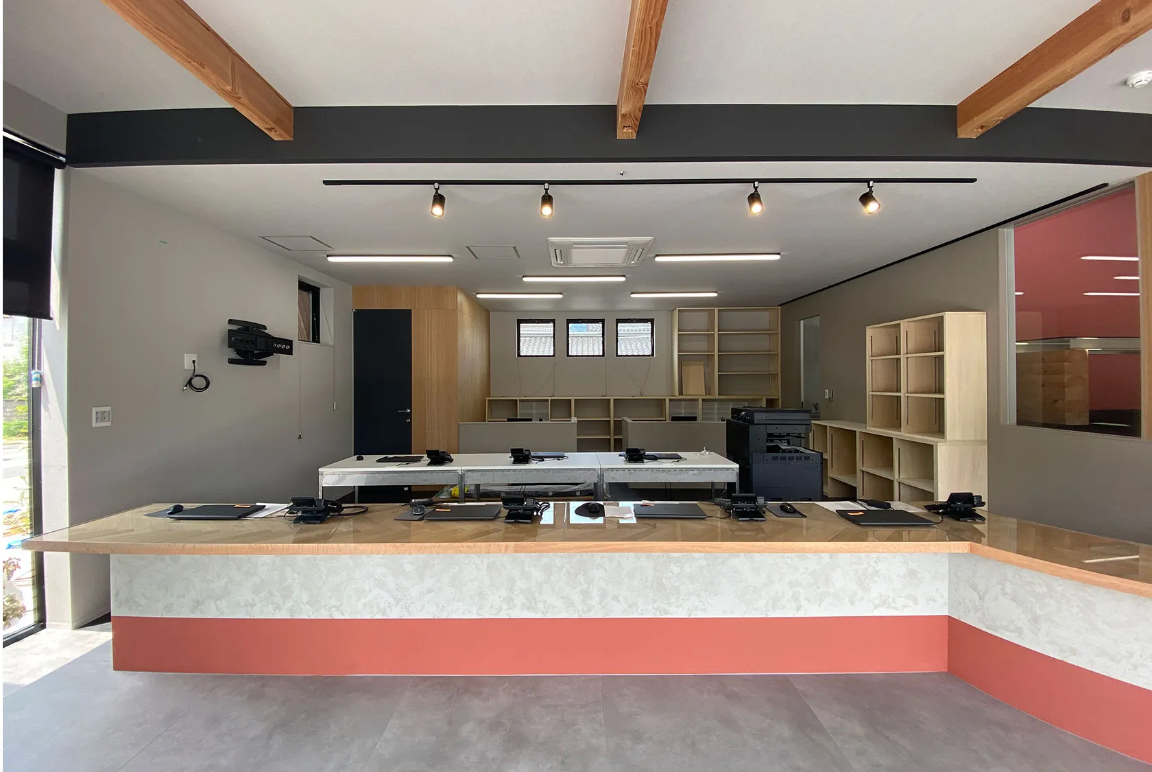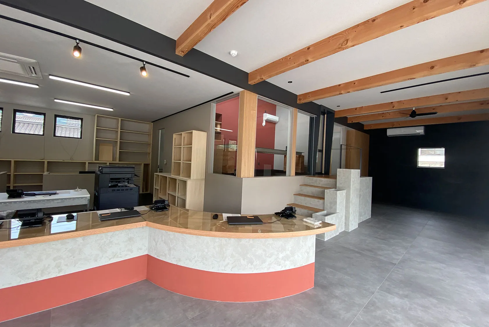 たくさんのお客様が訪れる、エステートオフィス。 多くの人の暮らしの入り口となる場所だから…。 新しい暮らしへの期待感を盛り上げられる場所になるよう、ポップで楽しいオフィスを計画しました。 モノトーンの無機質な空間に明るいカラーやポップなデザインのコントラストが実に楽しい空間です。 アールのカウンターはヘリンボーン貼り、オリジナルのガラステーブルなど、ここで働きたくなるようなオフィスを計画します!