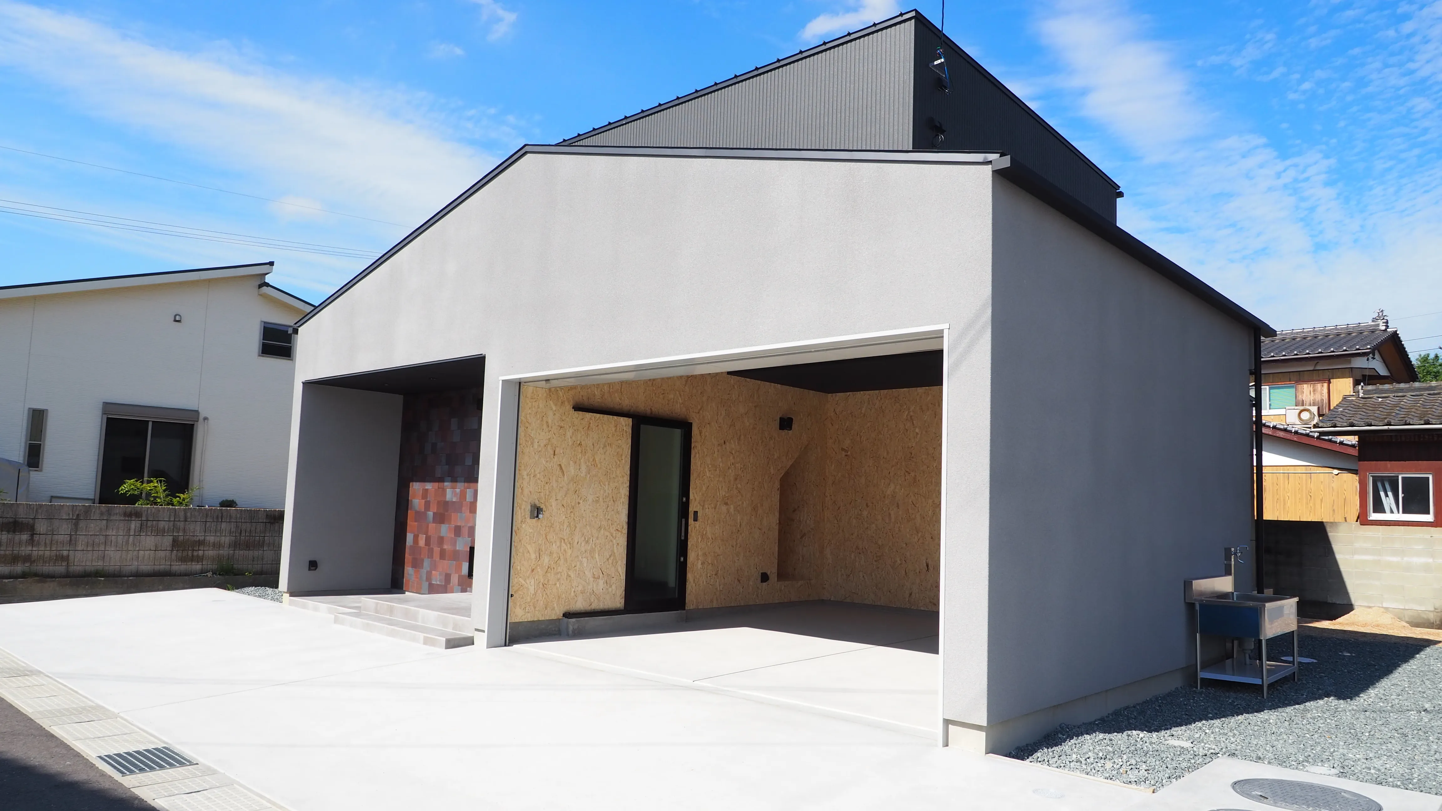 スモークグレイの塗りの外観。TVボードの淡い木板。色むらが美しいカップボードのタイル。 さりげなく、軽やかにグレイを纏ったデザインが主を迎え入れる。 バス釣りが趣味のオーナー様、アルミボートやフィッシングツール保管のガレージハウス内は、OSBボードでカジュアルに。 やさしく凛としたグレイ×異なるマテリアルたちの豊かな表情、それらが織りなす心地良い空気に、思わず呼吸が深くなる一邸。