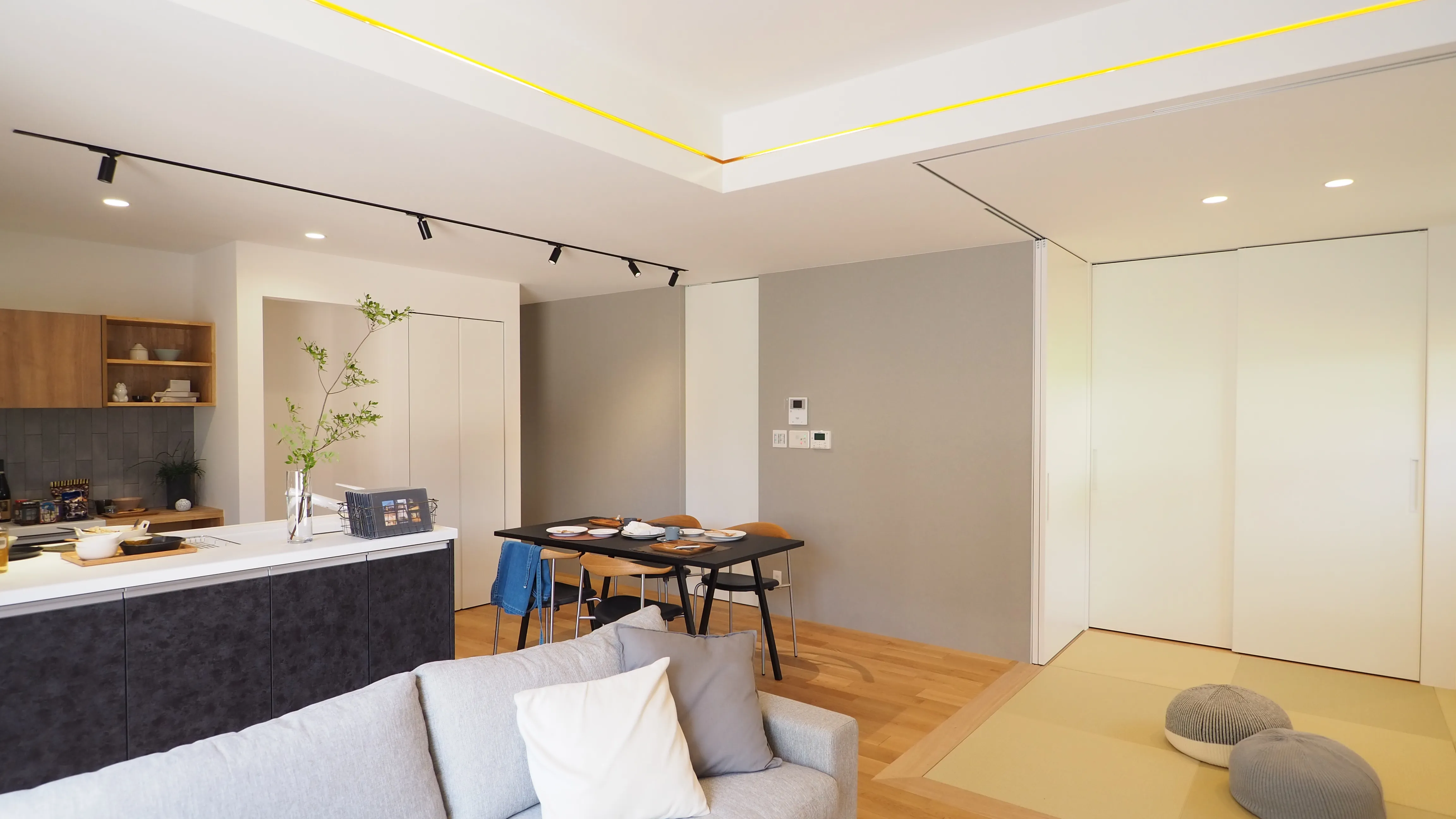 -美しいライン照明- リビング中央の天井に、L字にデザインされたライン照明。柔らかな灯りが、ホテルのような寛ぎ空間を作り出し、落ち着いた非日常を演出する。