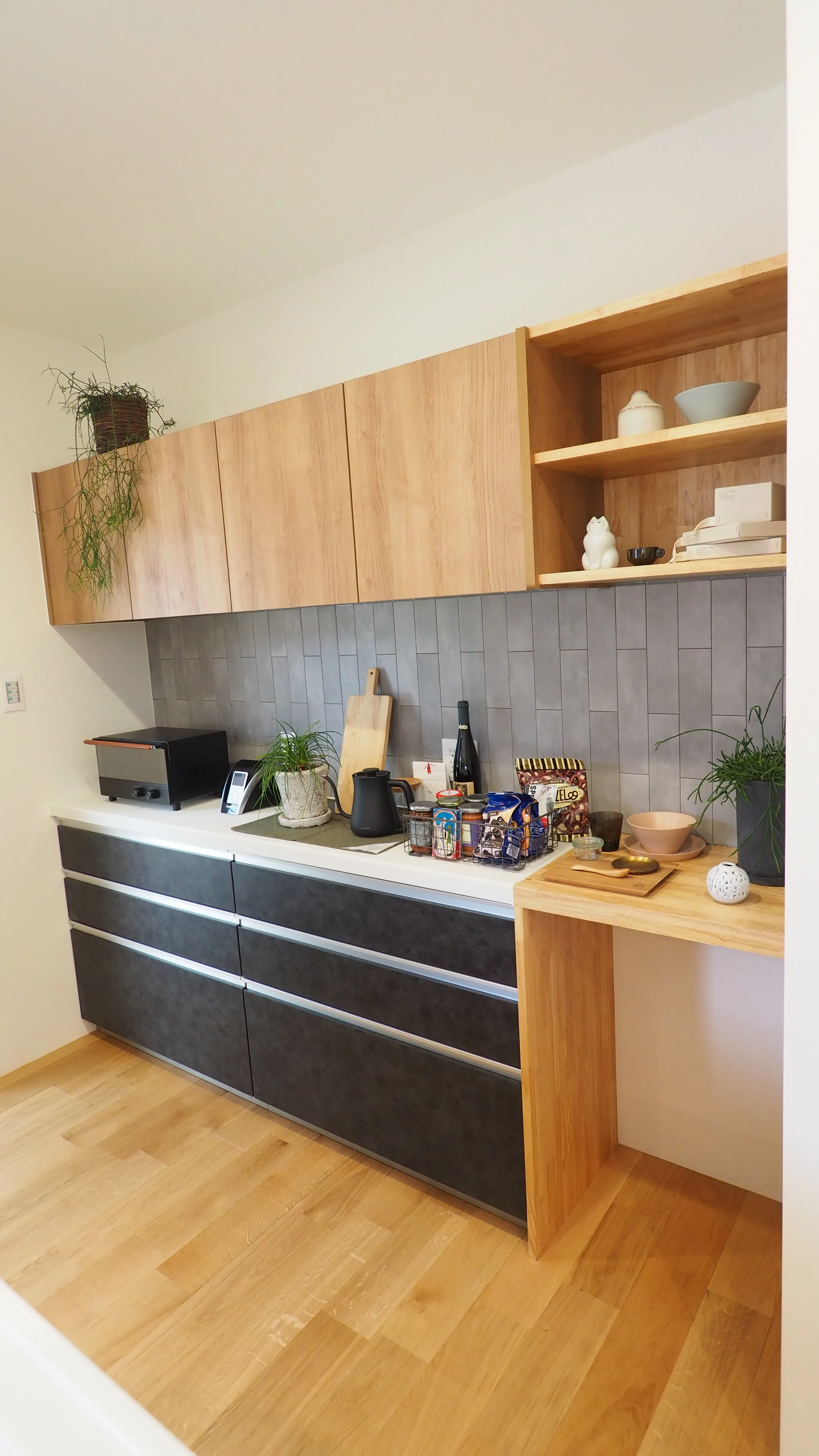 -グレイタイル×木目- タイルの色むらがデザインとなり、洗練されたキッチンの空間を演出。吊戸棚の木目柄を際立たせつつ、上品で印象的なデザイン。