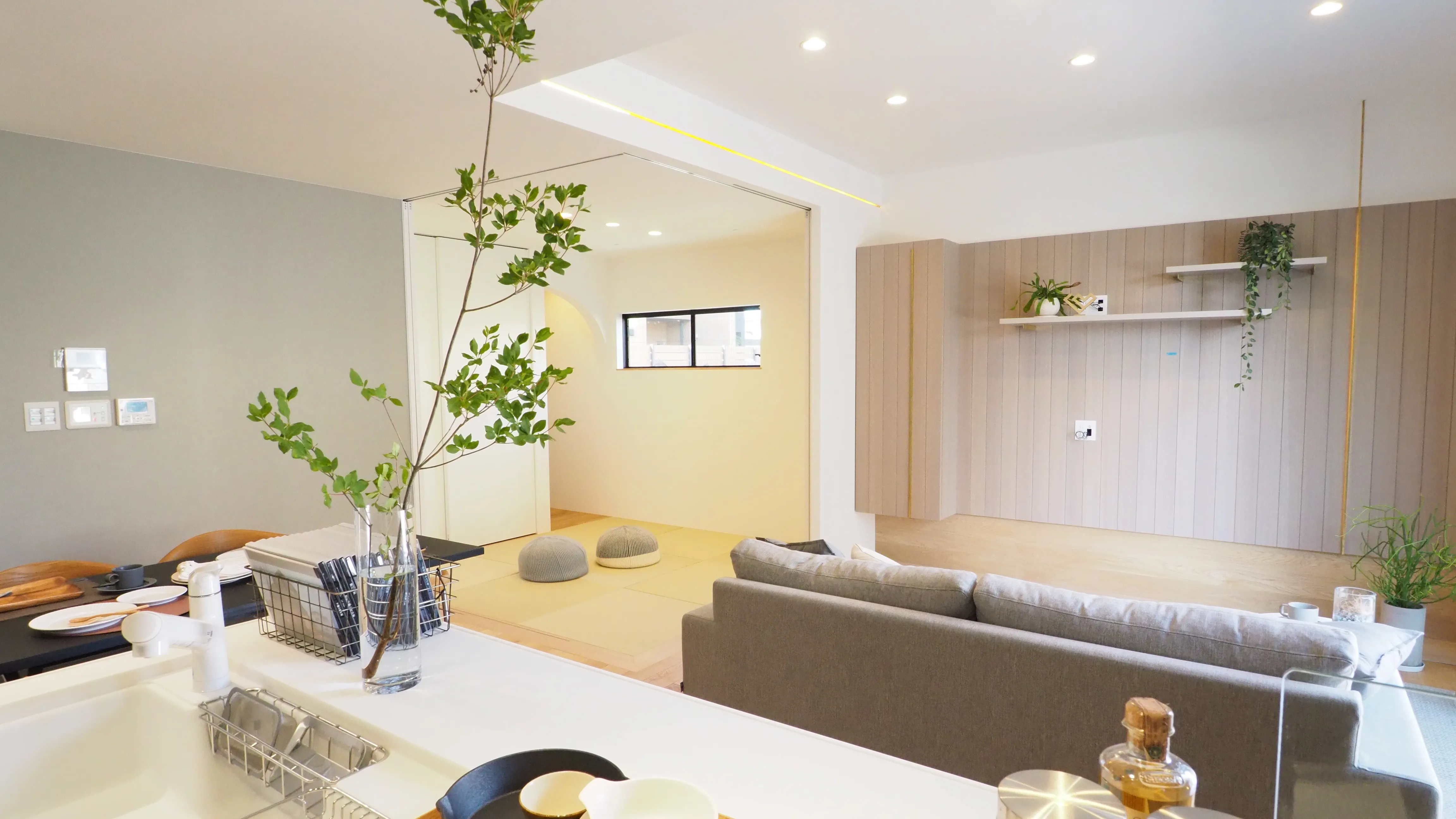 -キッチンからの景色- 小さなお子様たちの姿を見守りながら料理ができるように、という奥さまからのオーダー。リビングから続く和室までを見渡せる安心のプランニング。日々の暮らしの中で、成長も見守ることのできるステキな定位置。