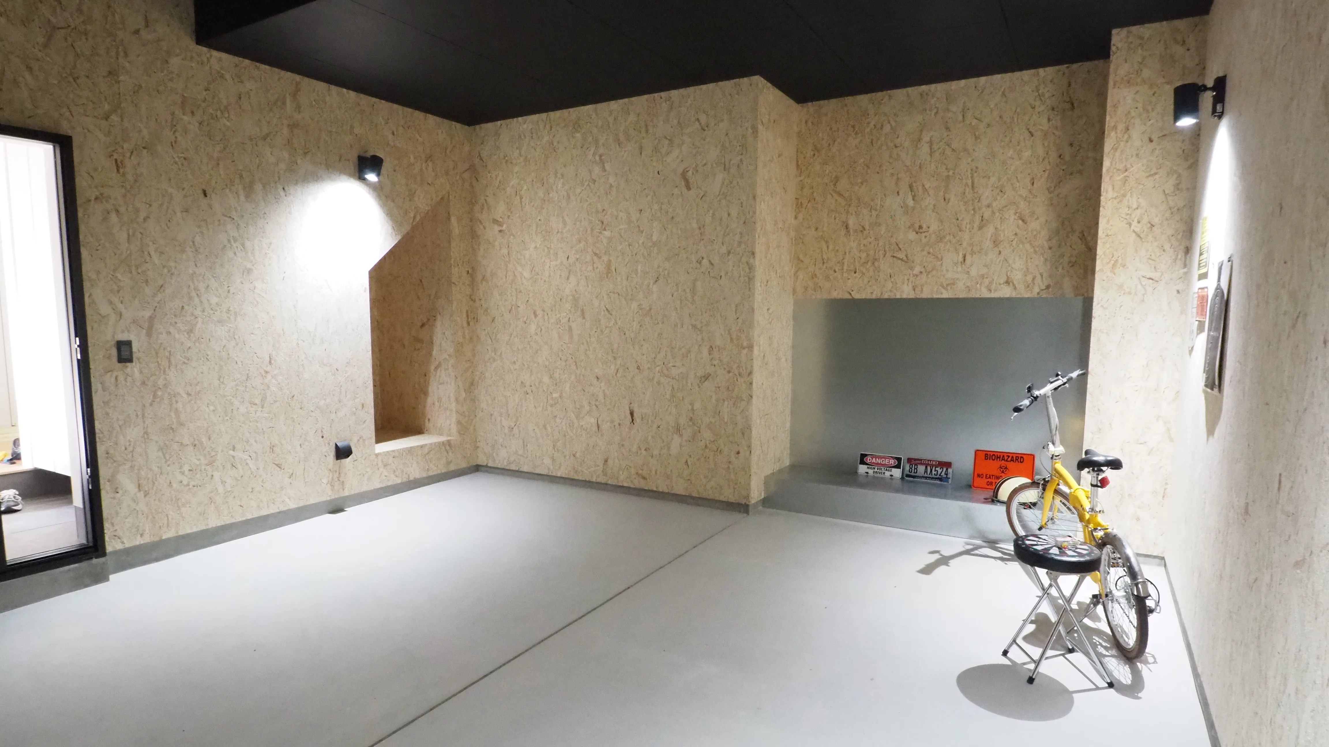 -ビルトインガレージ- 階段下を利用した空間は、趣味の釣り道具も収納できるスペースとして活用。アルミボート保管用に壁の一部に鉄板を施し、全面OSB合板で仕上げた、男の夢が詰まったガレージ。