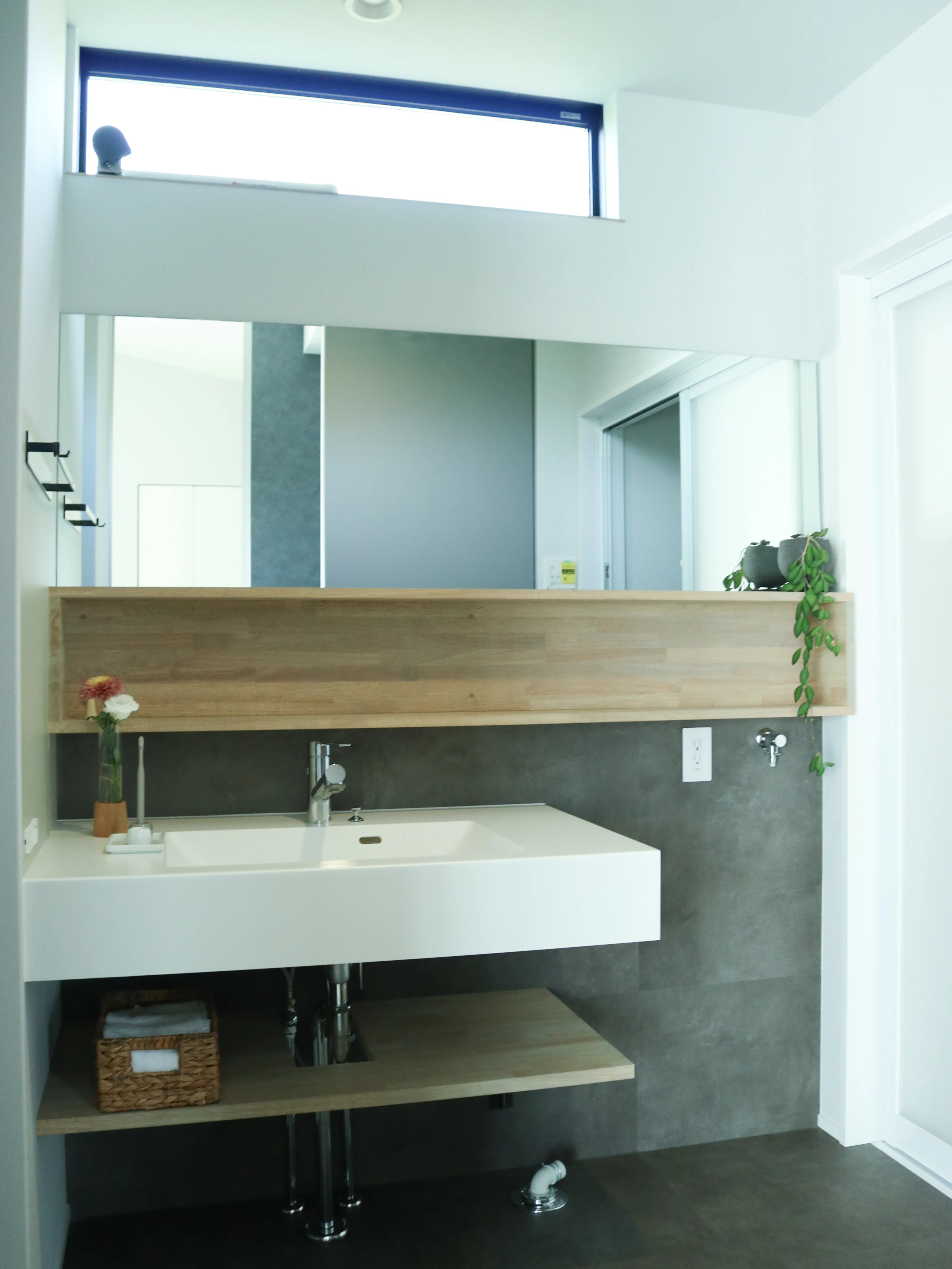 -Lavatory- コンパクトな空間を活かしたナチュラルな収納棚。 木がプラスされることで温かさが生まれます。 大きな鏡が空間を広く見せてくれる設計に