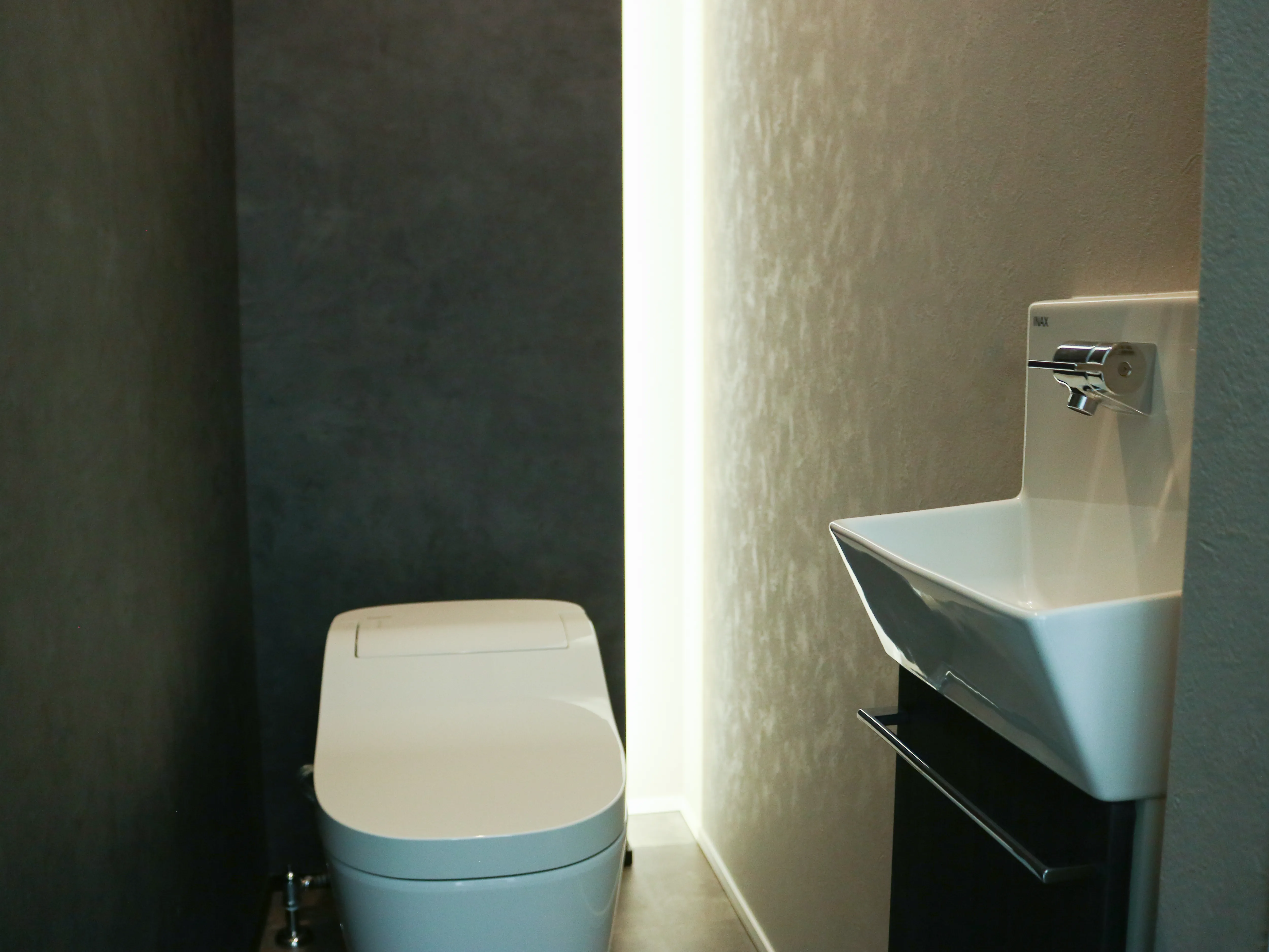 -Restroom- グレーと白の配色に背面収納を採用したことで シンプルでスッキリした空間に。 間接照明が落ち着いた空間を演出してくれます。