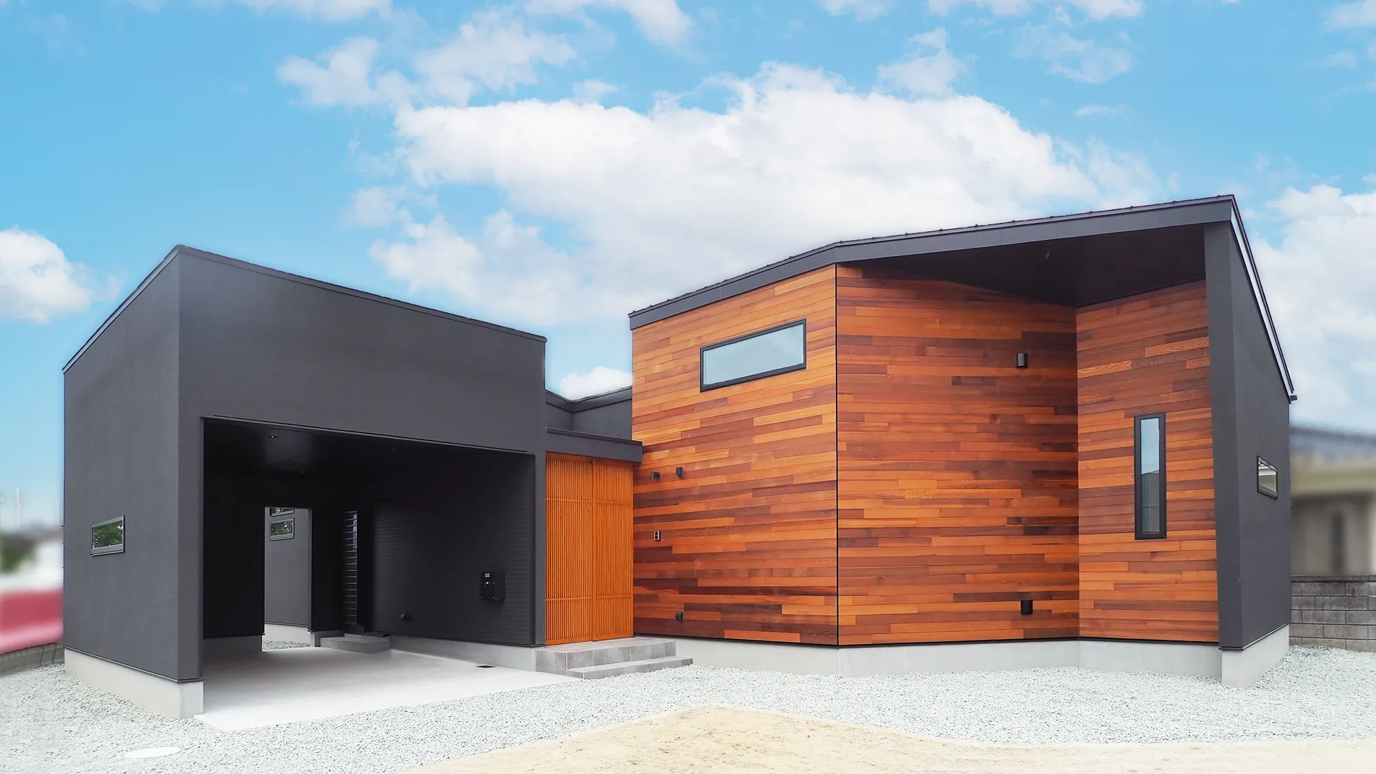 -Exterior- レッドシダーを贅沢に貼り、黒い外壁とのコントラストが目を惹きつける外観に。