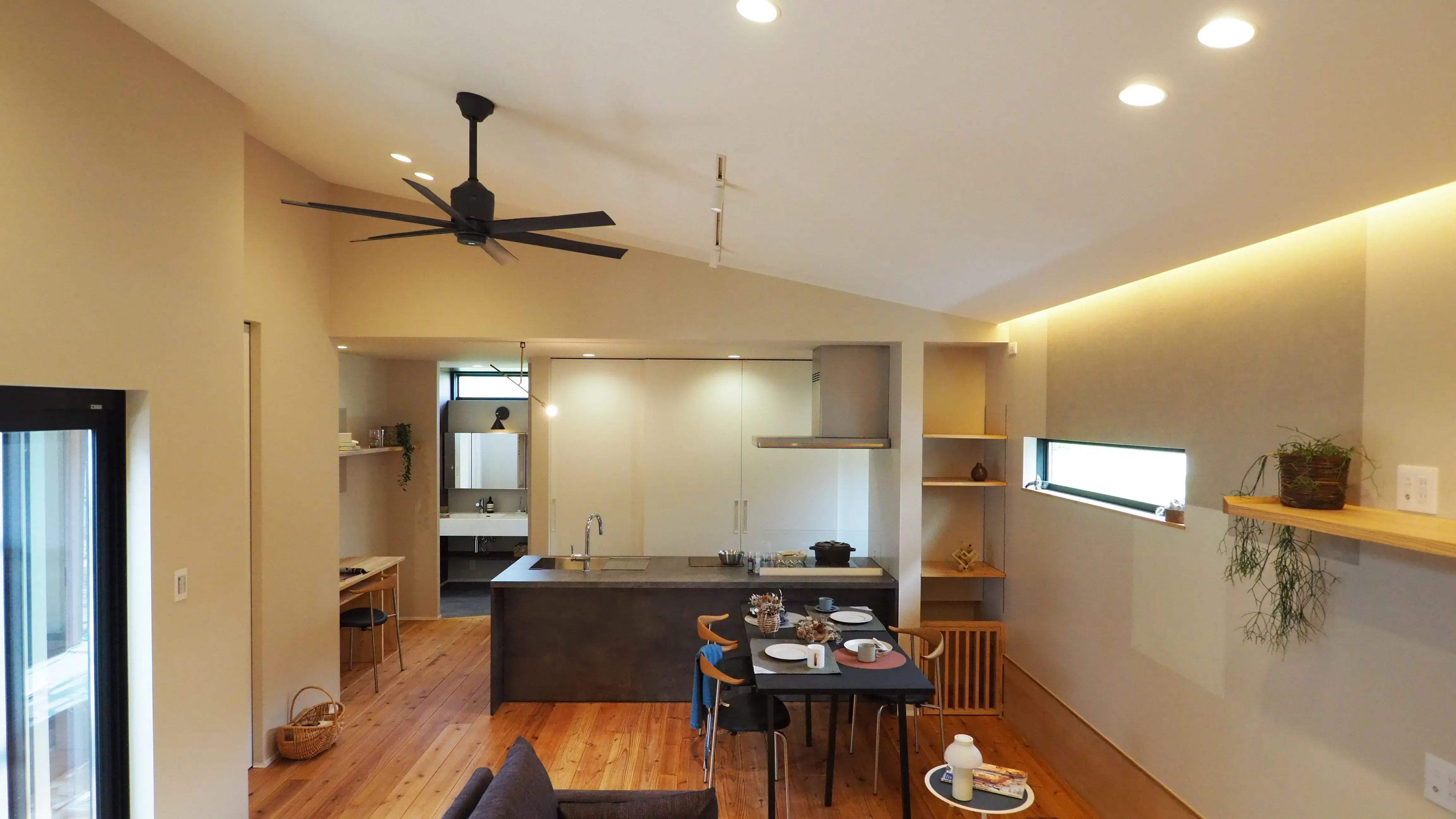 -LDK- 斜めに伸びる勾配天井。 あたたかな光で包みこむ間接照明。 床材に使用した無垢の杉からはあたたかみを感じます。