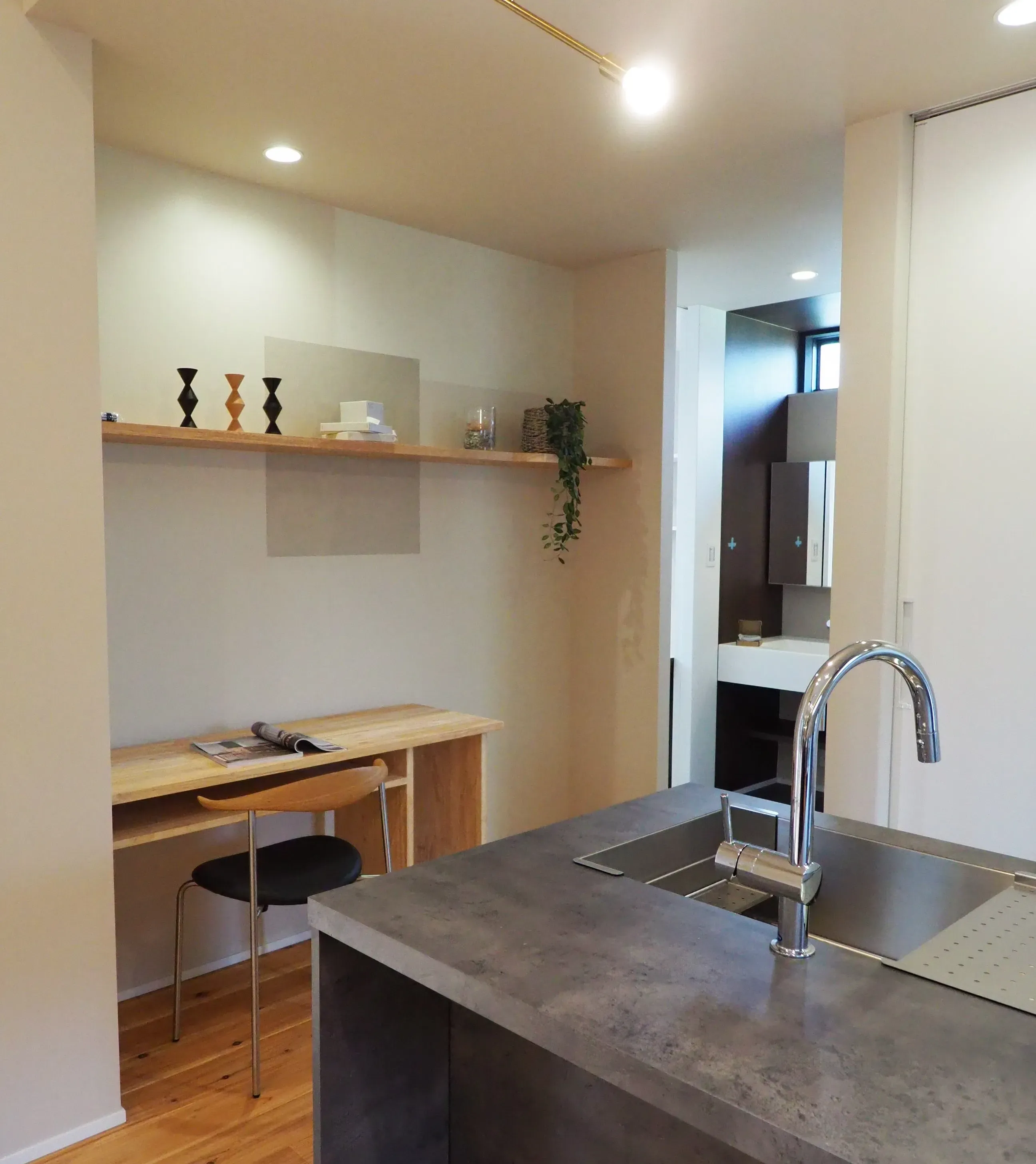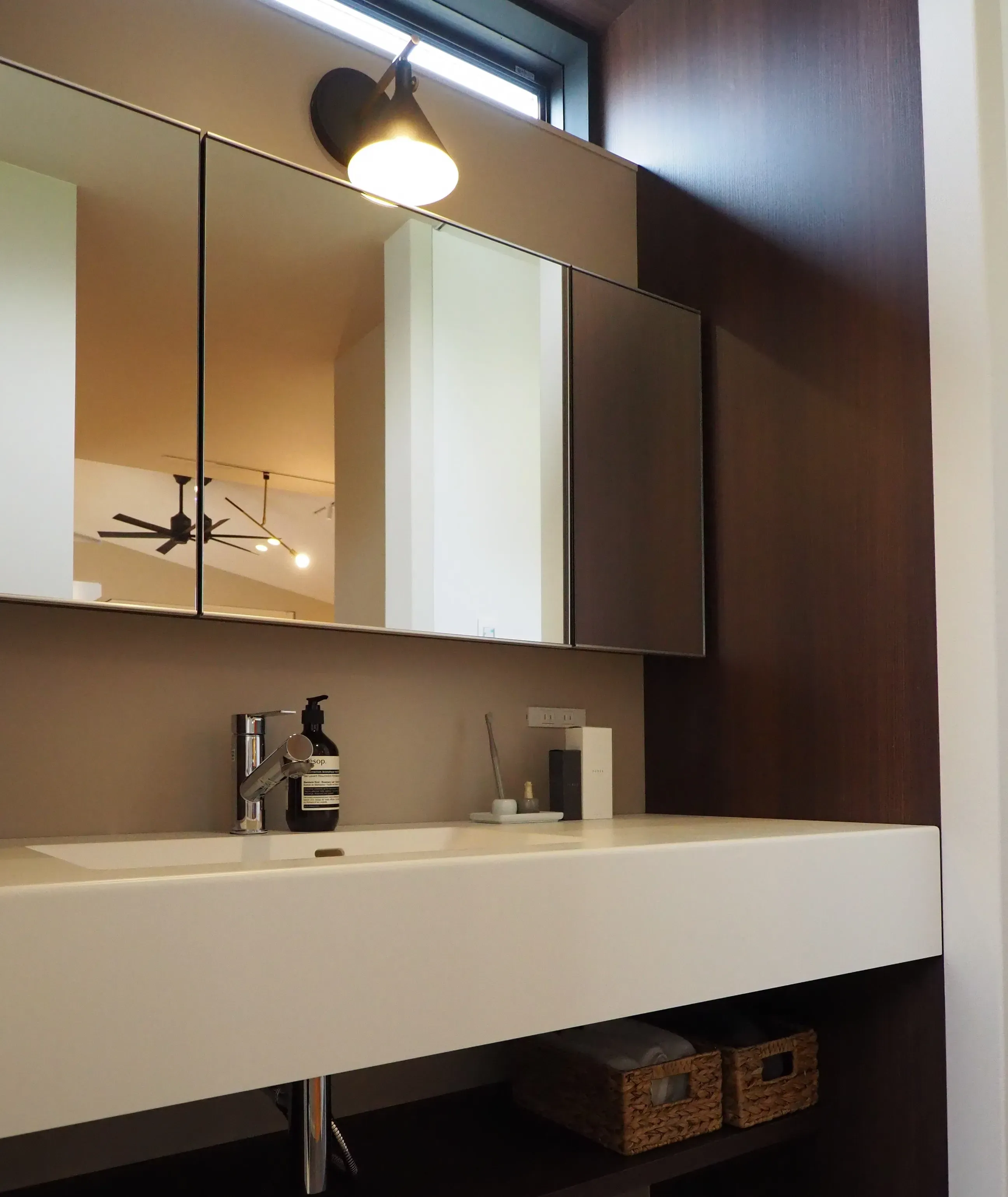 -Lavatory- シンプルでありつつ、シックな印象の造作洗面台。 ミラーの中は機能的な収納。 ブラックのブラケットライトが空間を引きしめます。