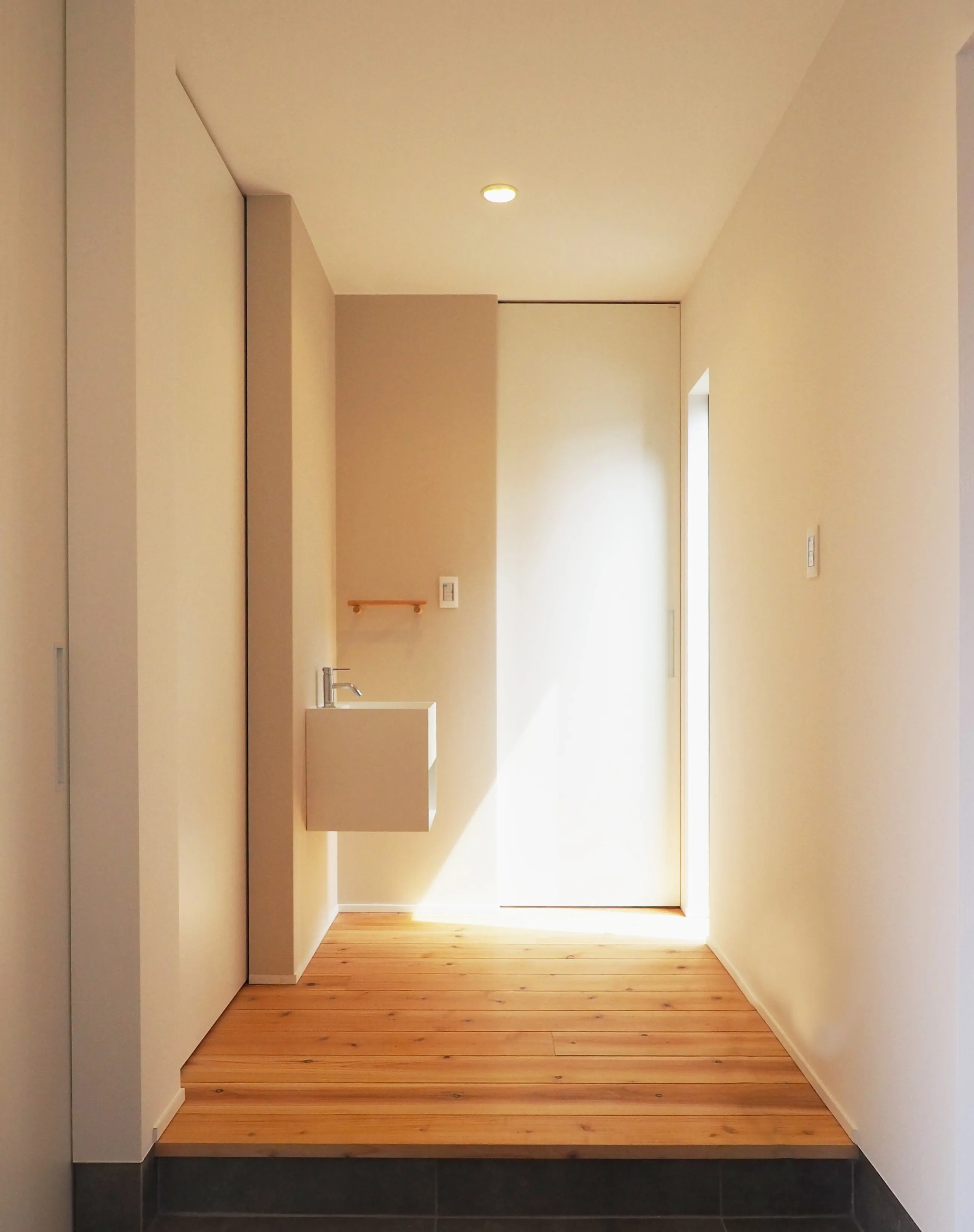 -Hall- 縦長の窓から差し込む光が心地良く、優しく出迎えてくれる玄関ホール。 帰宅してすぐに手洗いが叶います。
