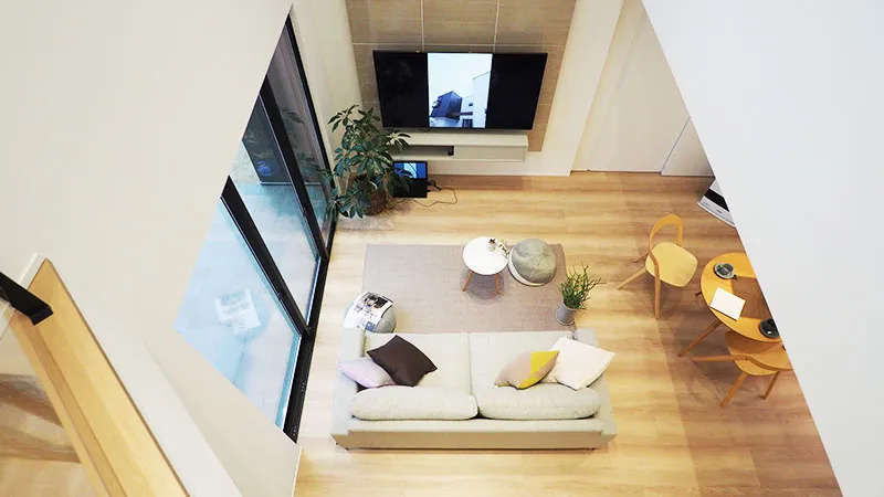 -リビング- 2階からリビングが見下ろせる吹き抜け。 テレビ背面にはタイルが輝きます。