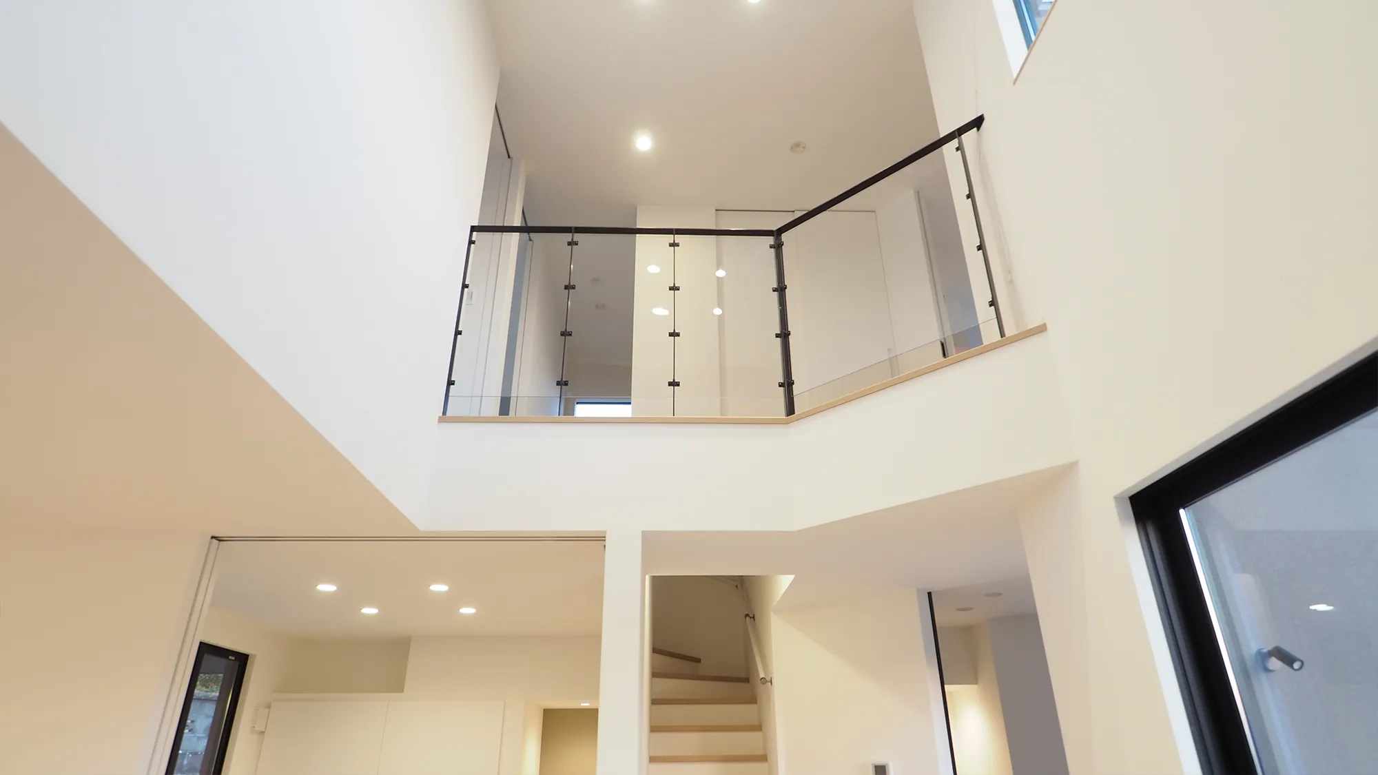 -アクリルとアイアンの腰かべ- 2Fホールの腰壁をアクリルに。 より開放的で広がりを感じられます。 真っ白の空間をブラックのアイアンでひきしめて。