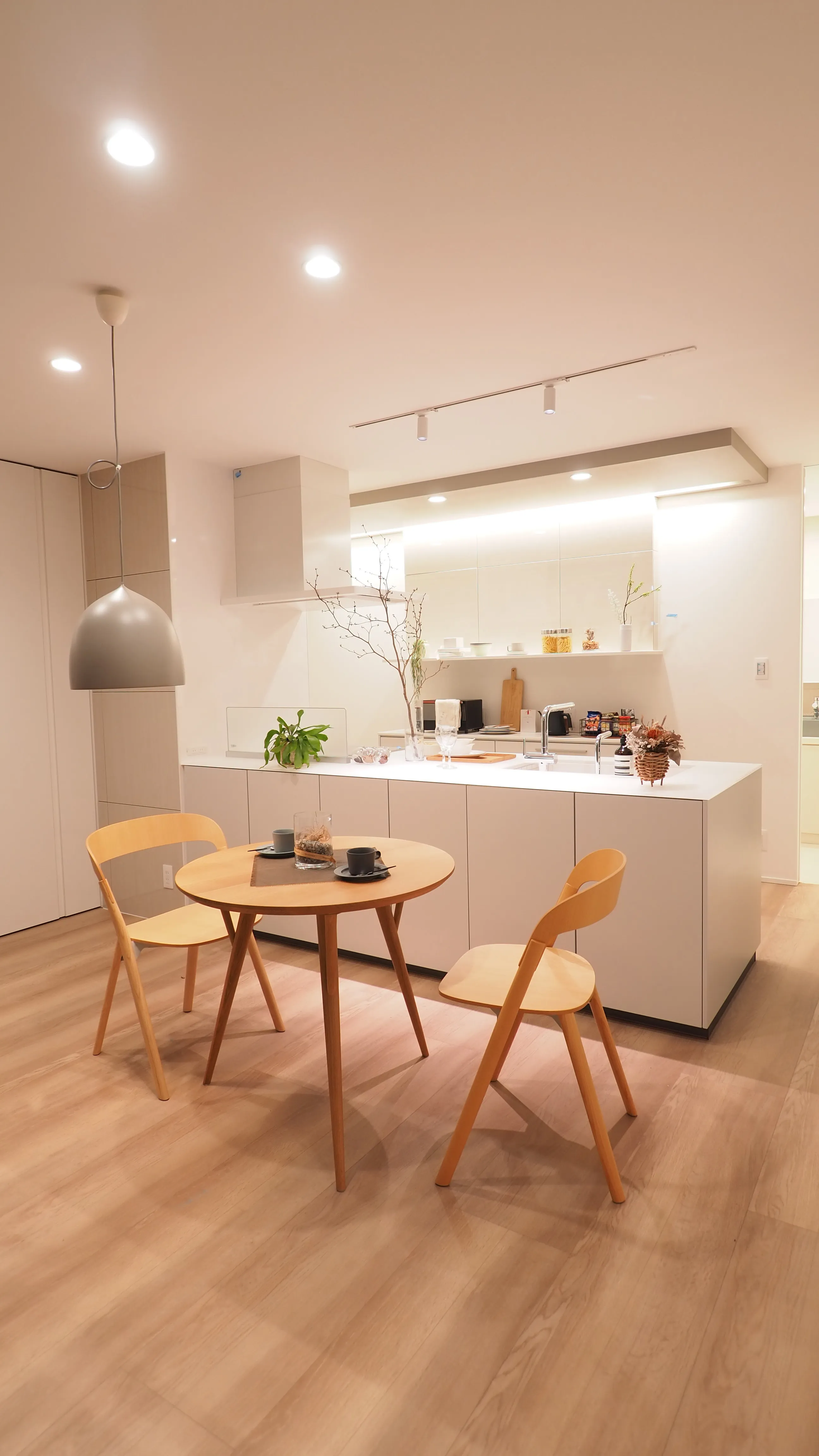 -光をまとうキッチン- ホワイトクロスとアイボリーのタイルで 洗練されたダイニングキッチン。 あたたかみのある木目の床が、落ち着きをもたらします。