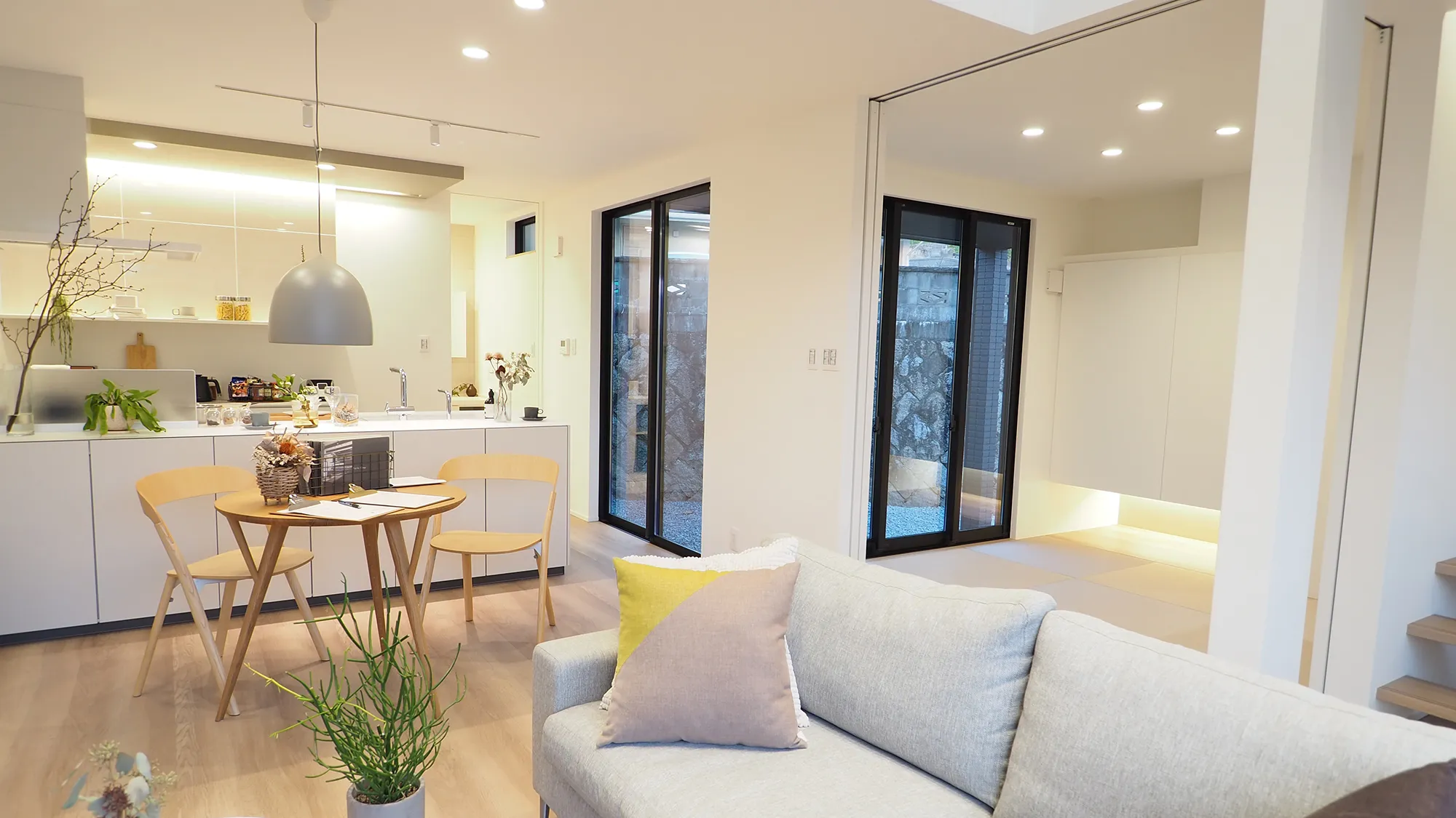 -リビングと和室- 和室と一体になった広々としたリビング。 間仕切り扉で区切ると来客時の宿泊部屋に。 間接照明がうつくしく光ります。