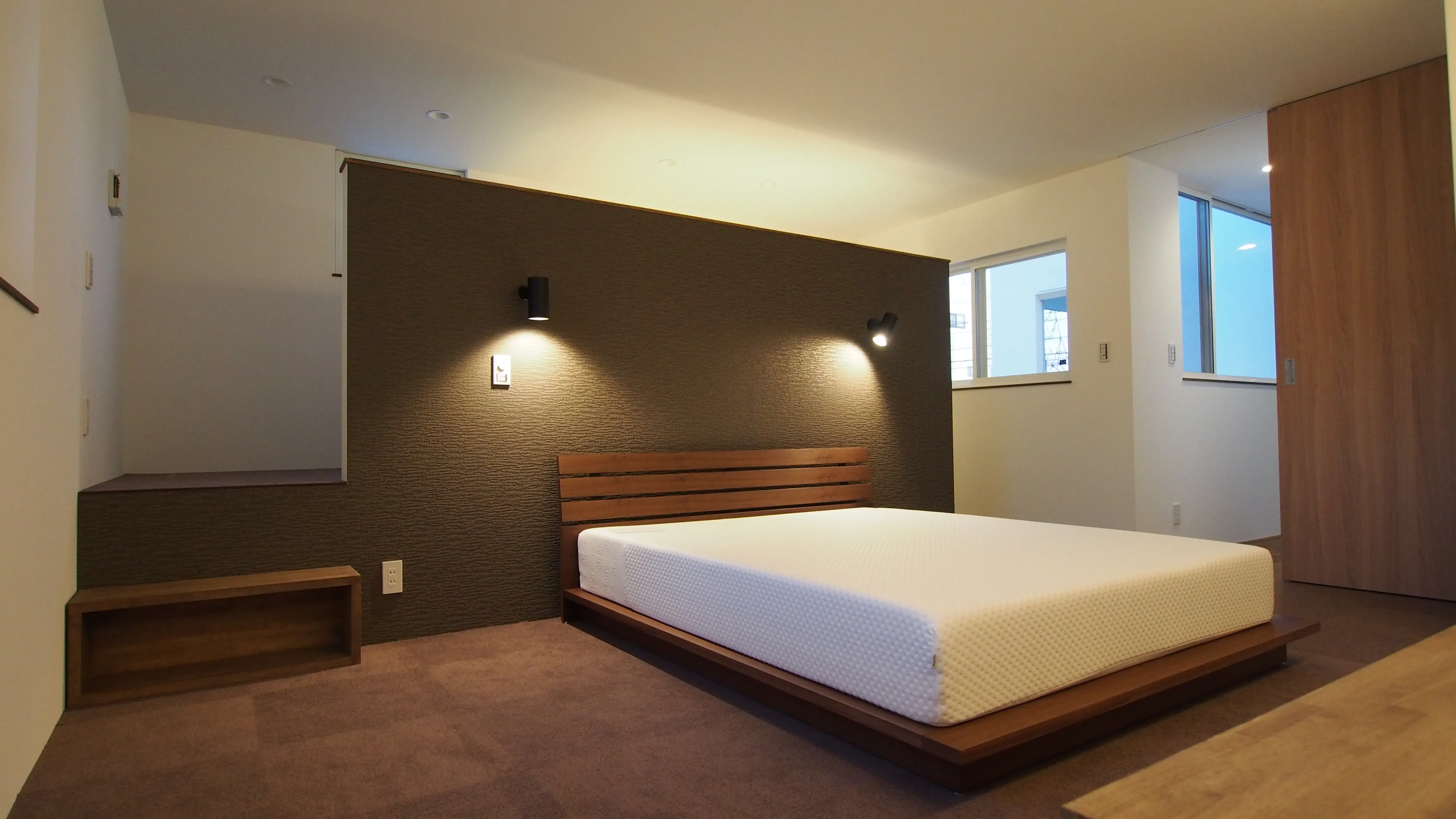 -休息を満喫する寝室- 第二のリビングとなる寝室。休日や一日の終わりに心からリラックスして過ごせるよう、贅沢な仕様の寝室に。絨毯が敷き詰められ、小上がりのスペースやメークブースが面白い。