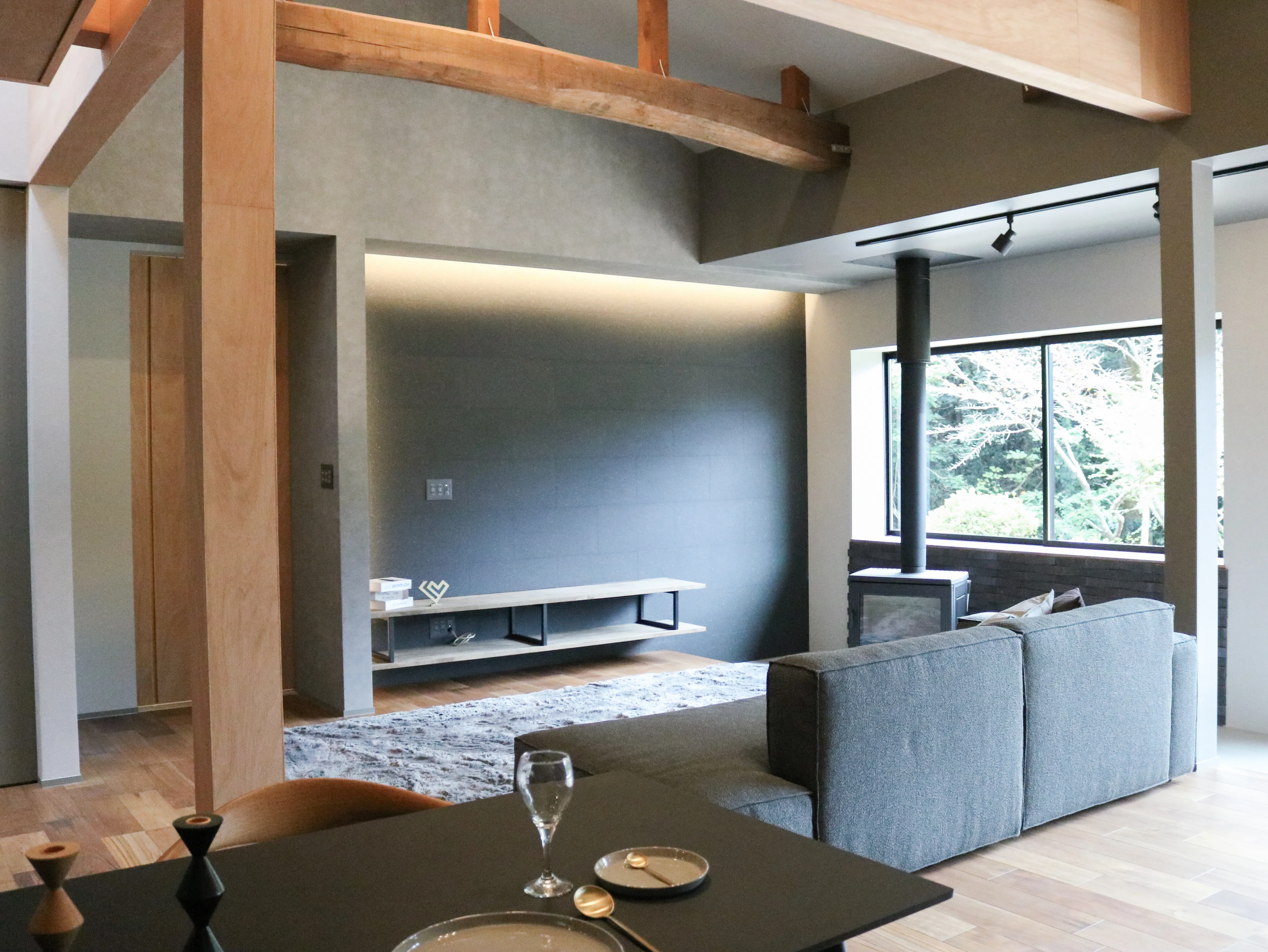 素地を活かしたリノベーションハウス。 細部にまでこだわりを詰め込んだ邸宅に仕上がりました。 落ち着いた色味が 室内からも自然を望める癒しの贅沢空間。