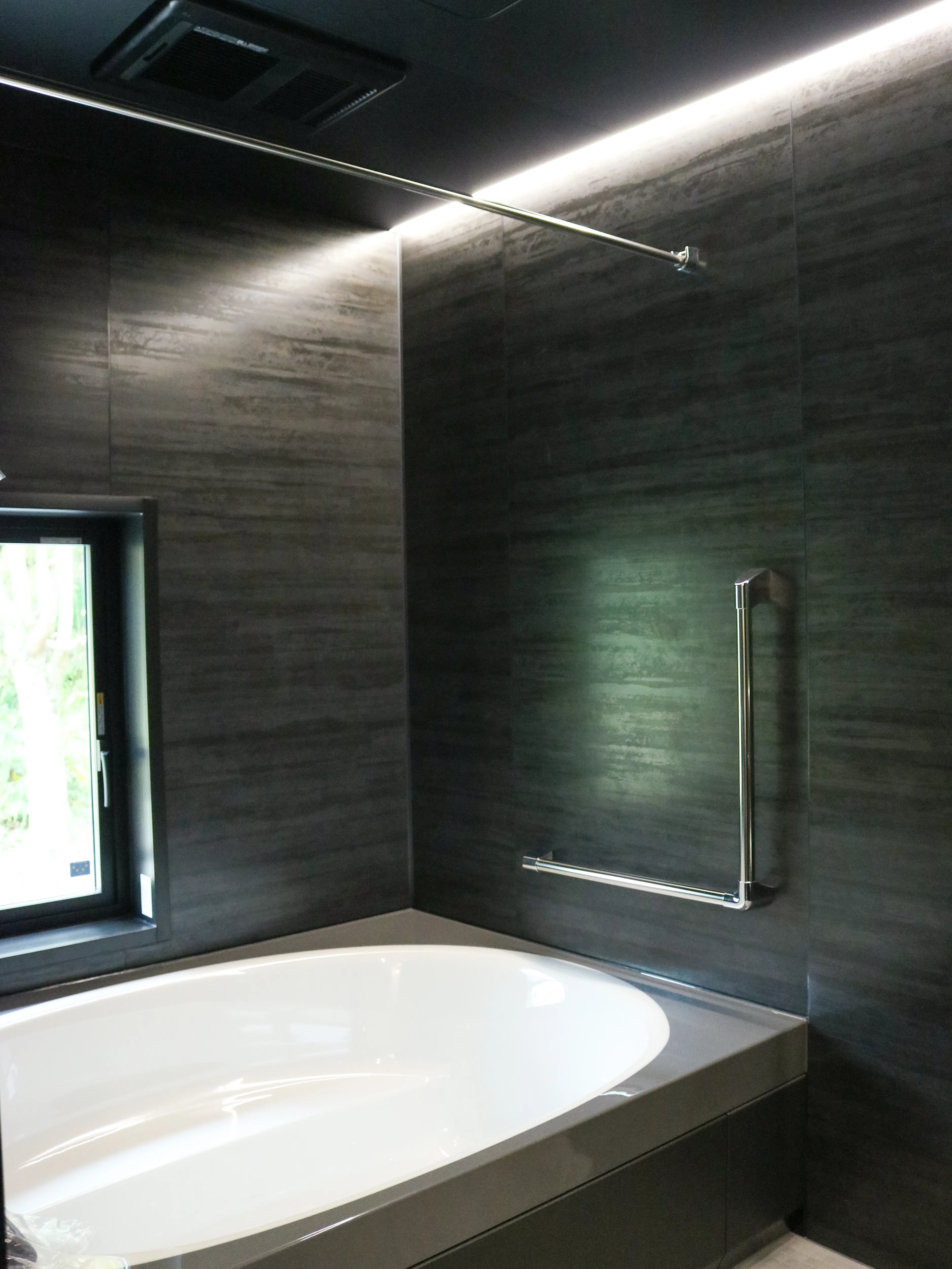 -bath room- ダークトーンでシックな色味で落ち着きのある空間に。 自然が望める浴室は癒しの