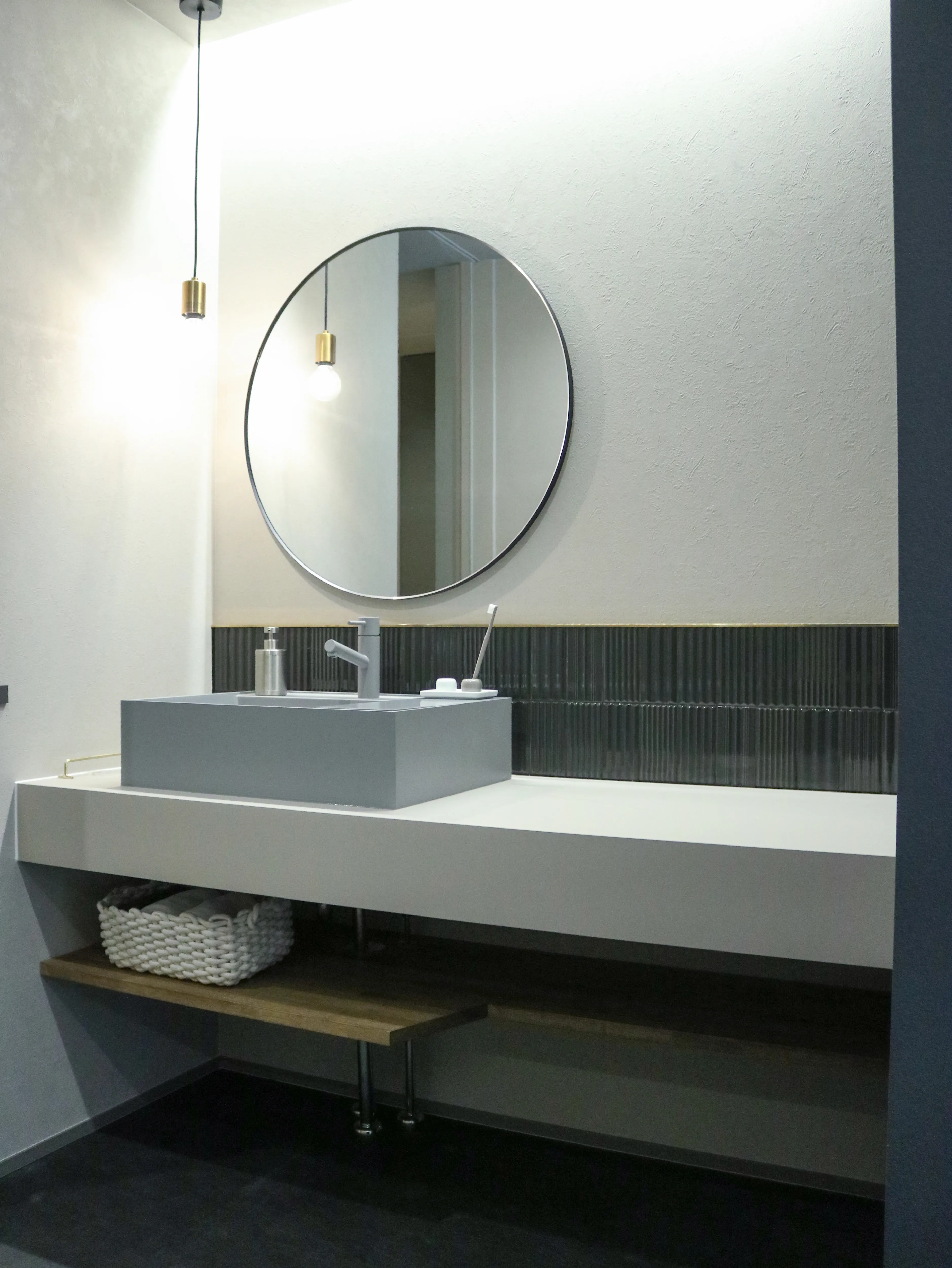 -Lavatory- 黒のタイルが高級感のある印象に。 再度の収納棚は空間をスッキリさせ、使い勝手の良い洗面室が仕上がりました。