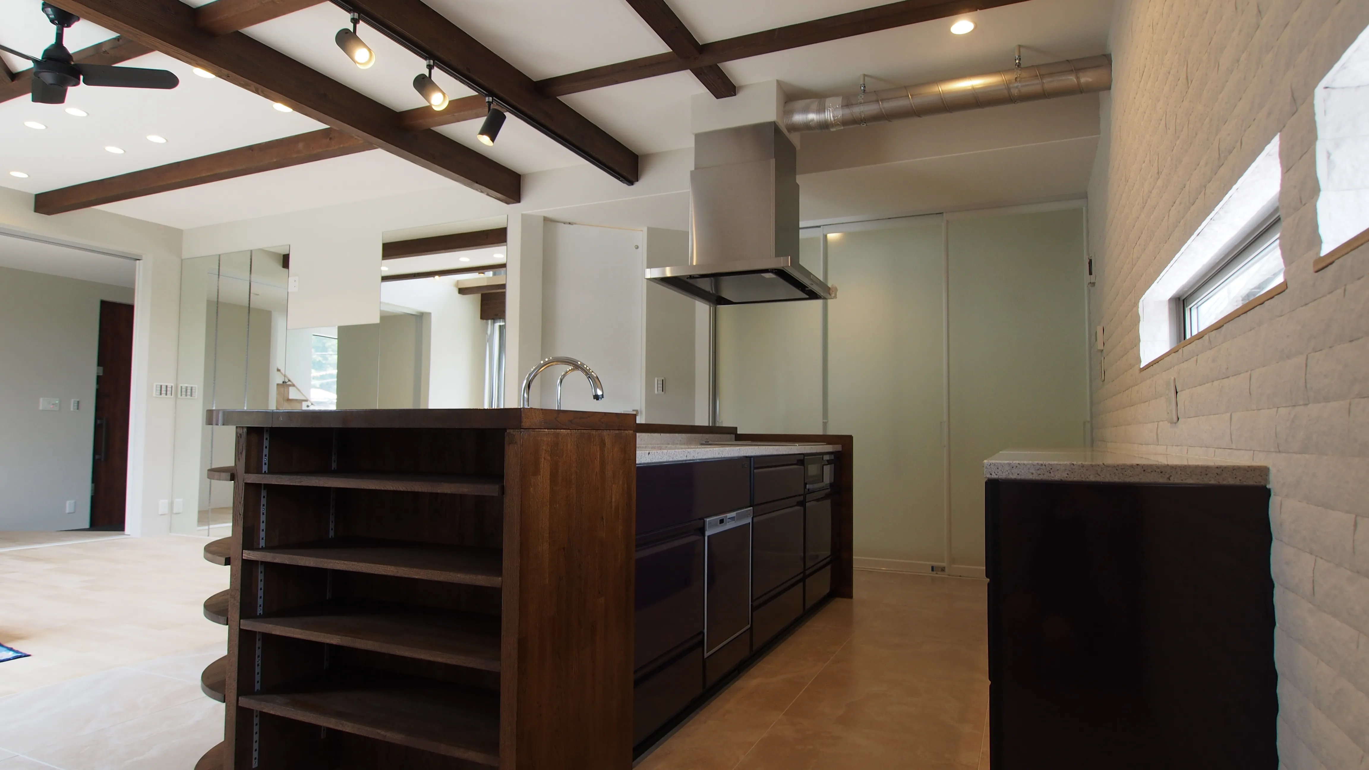 1階にワンルーム住居を2室計画。2階から3階に住居を構える。1階のワンルームはライフステージやライフスタイルに応じて、オーナご自身が客室、趣味の教室、店舗として利用することができ、収益物件としても期待できる。人気エリアならではの3階建て計画。1階を客室とすることで、住居は開放的な設計に。間仕切りを大きく開放することができ、各室の扉を開けると、リビングの吹き抜けを介して、全ての空間がつながる。洗面室やお手洗いなどのスペースも広く、贅沢な空間が心地よい。通りに面した敷地の特性を存分に活かし、活用に適した1階をフレキシブルに計画したことで、プライバシーを守り、開放的に暮らせる住居が実現した。