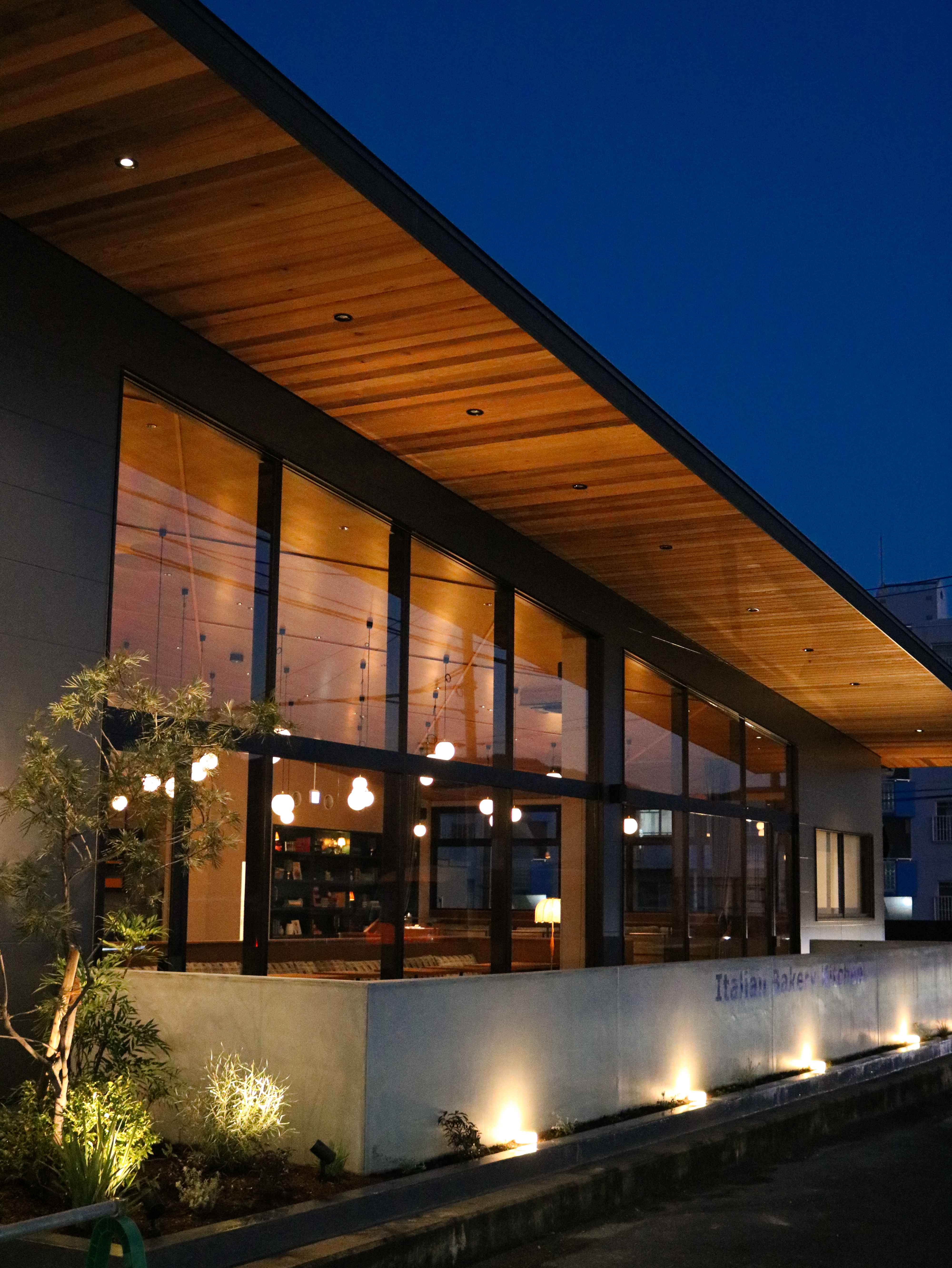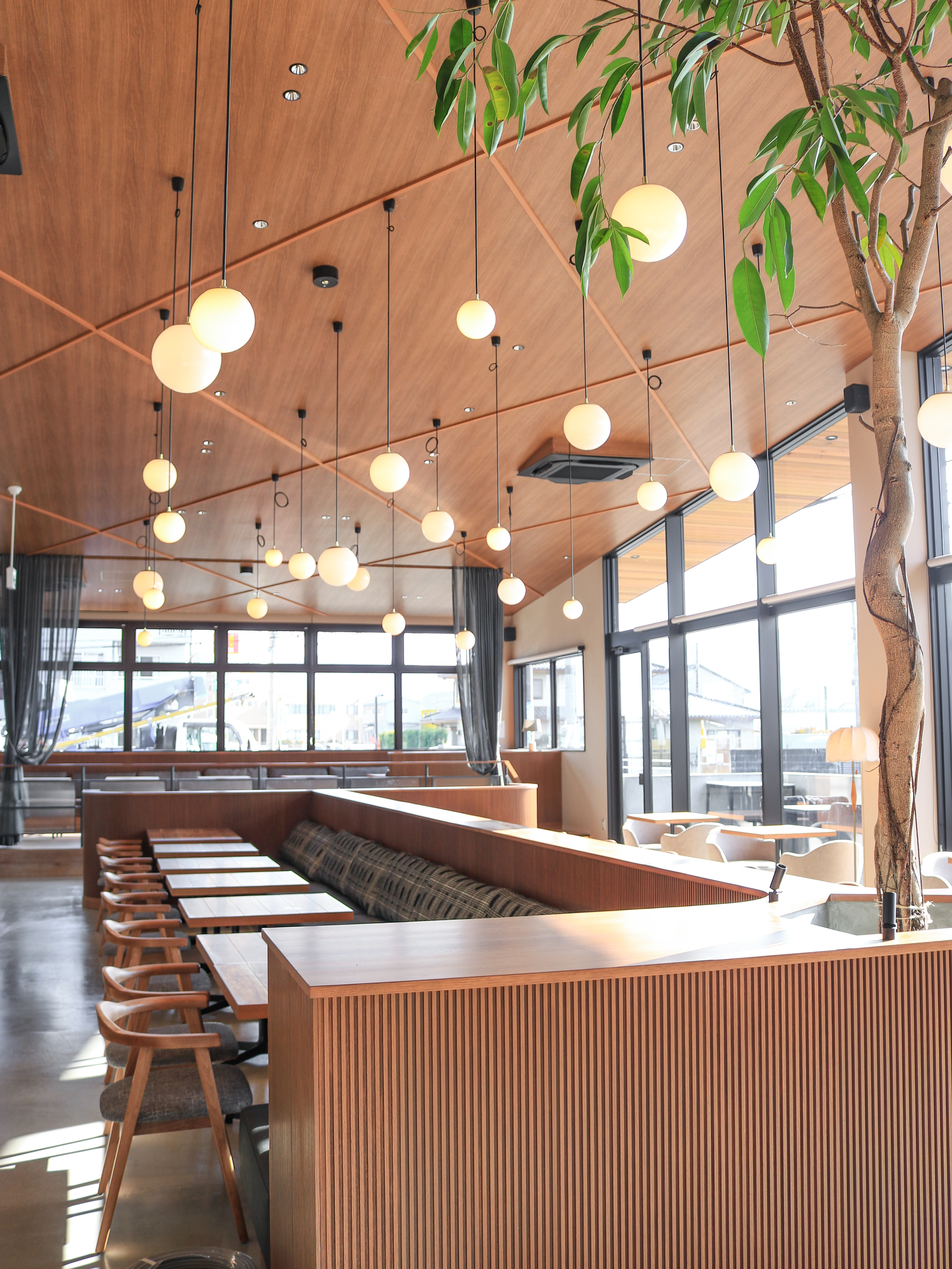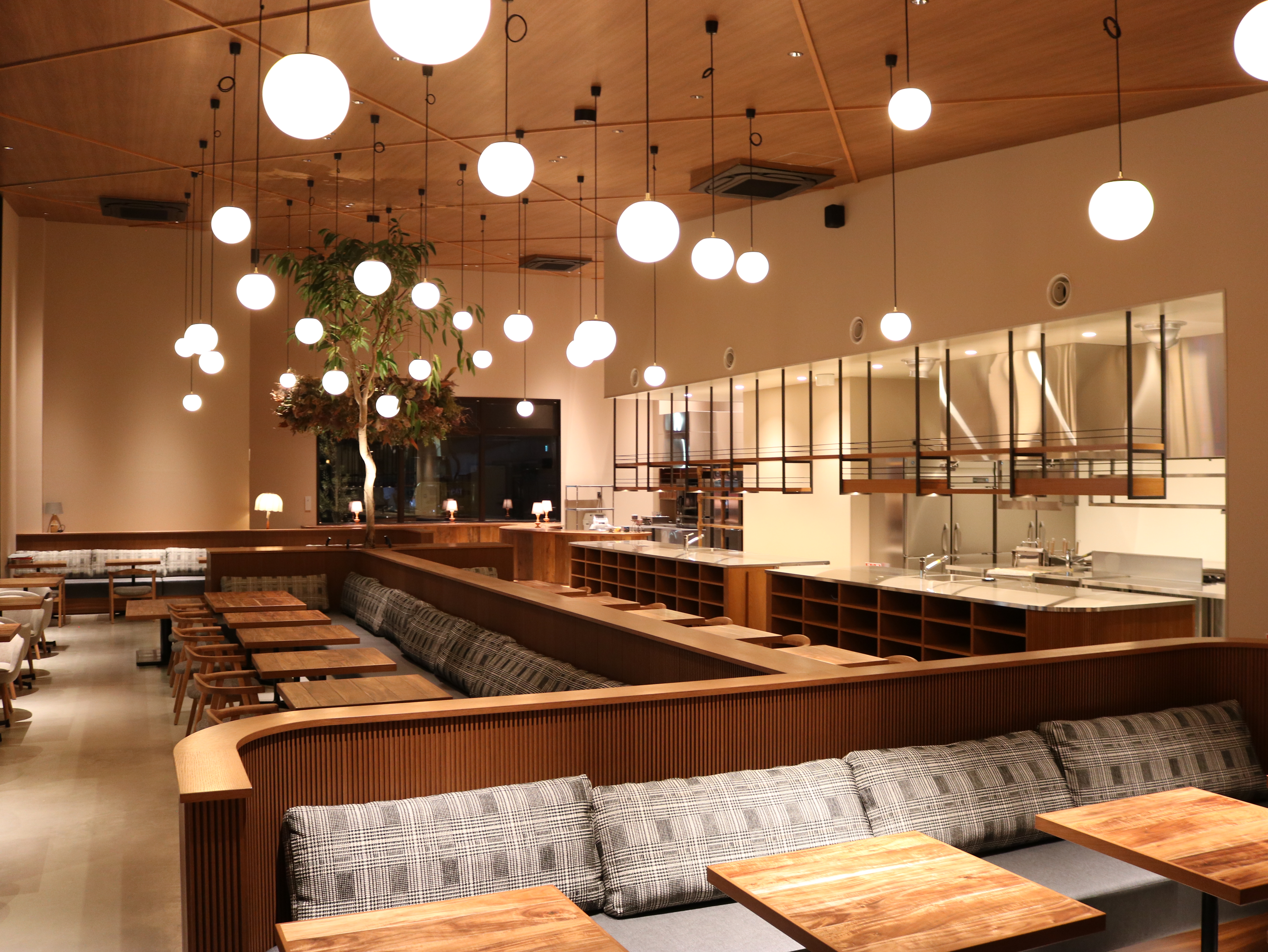 鉄骨造だからこそ実現できる柱や壁にとらわれない伸びやかな空間構成のカフェ&ベーカリー。 構造の強さをベースに光の入り方、視線の抜け、素材のバランスまで丁寧に設計しました。 上質さと、心地よさあを両立した木目を基調とした内装に、 リズムよく配置した照明が和らなか空気をつくりだします。
