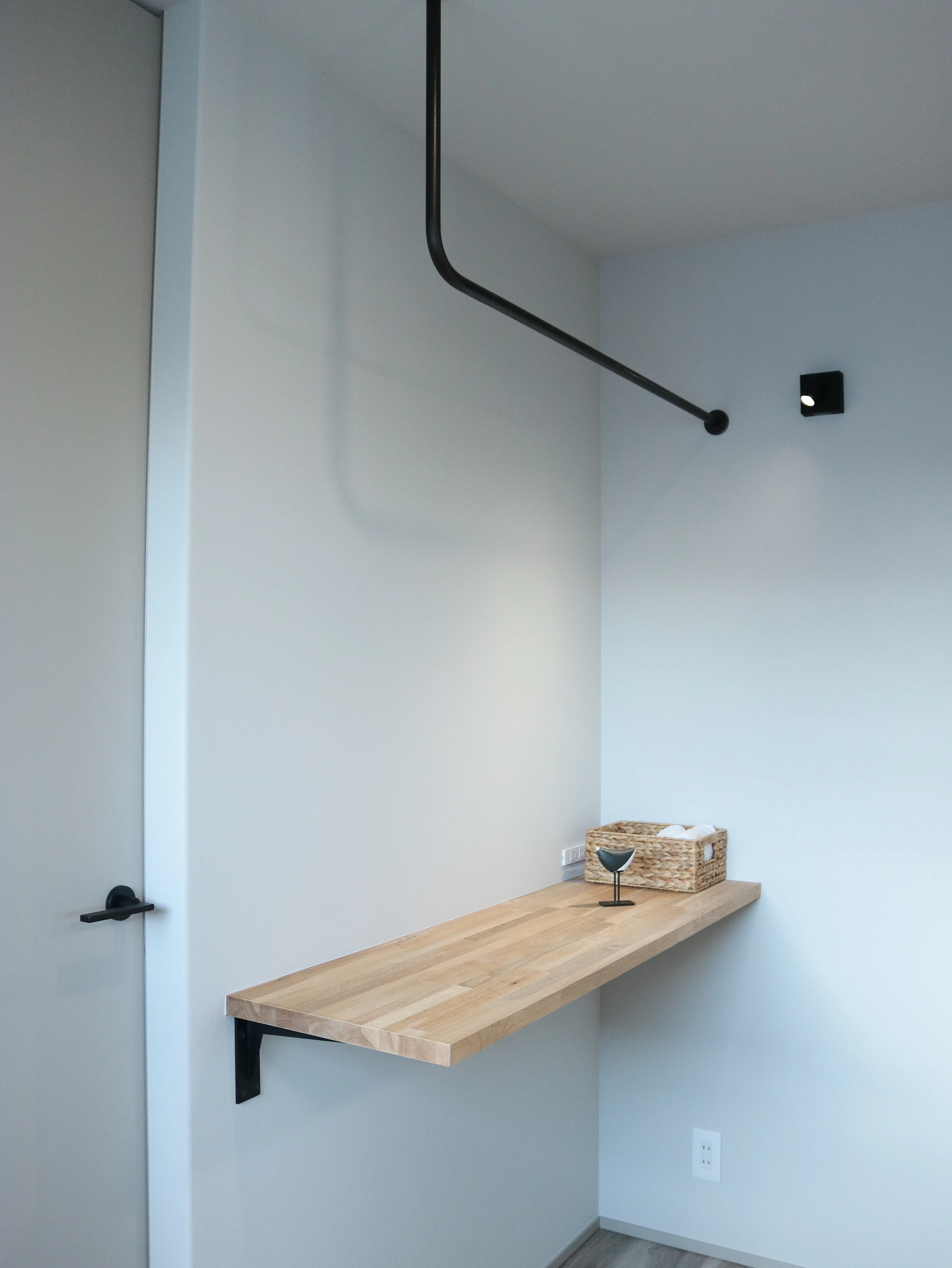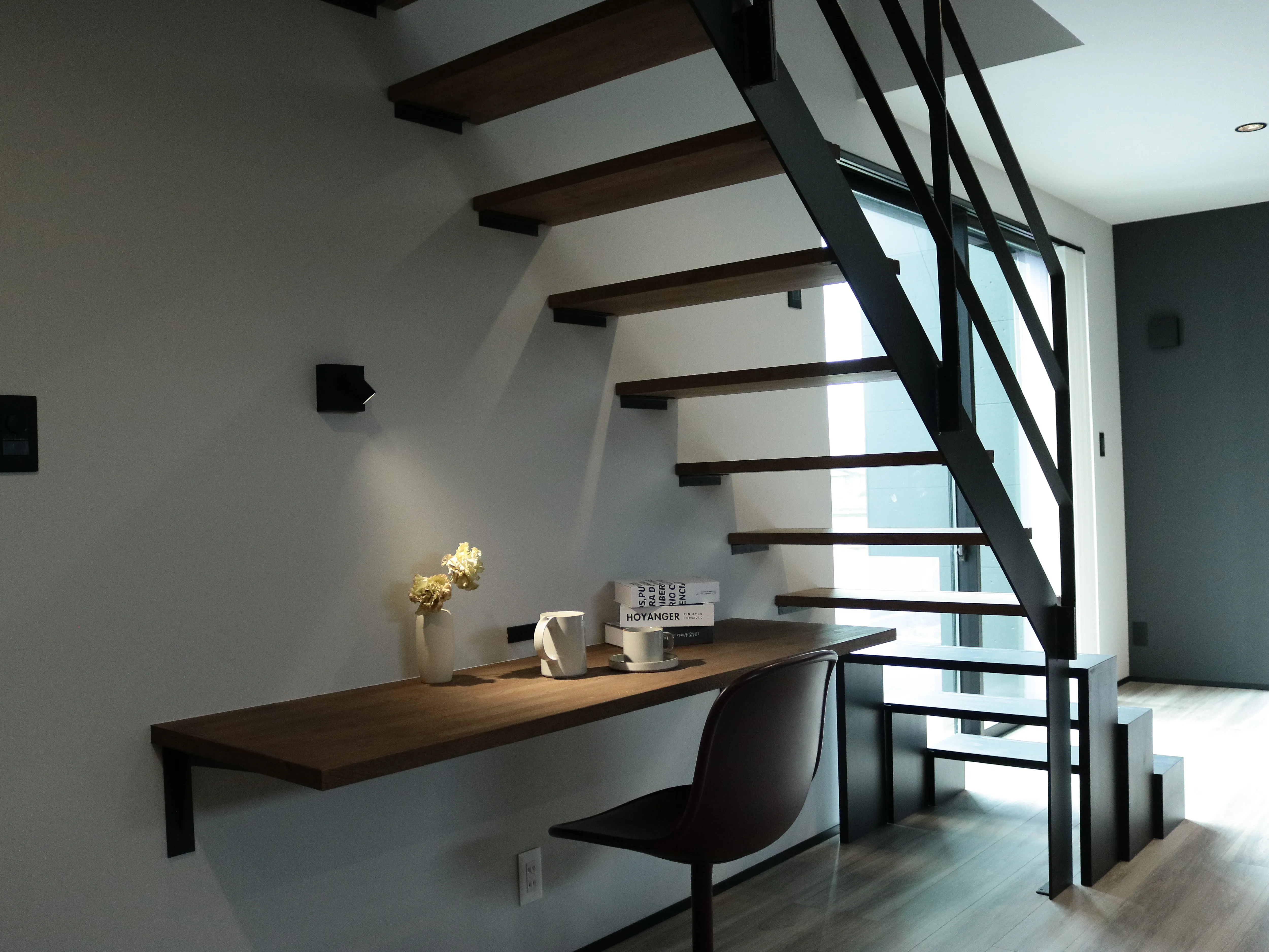-Study space- 階段下のスペースを有効したスタディースペース。 スケルトン階段だから圧迫感を感じない空間。 読書や書き物、お子様の勉強机しても活躍します。
