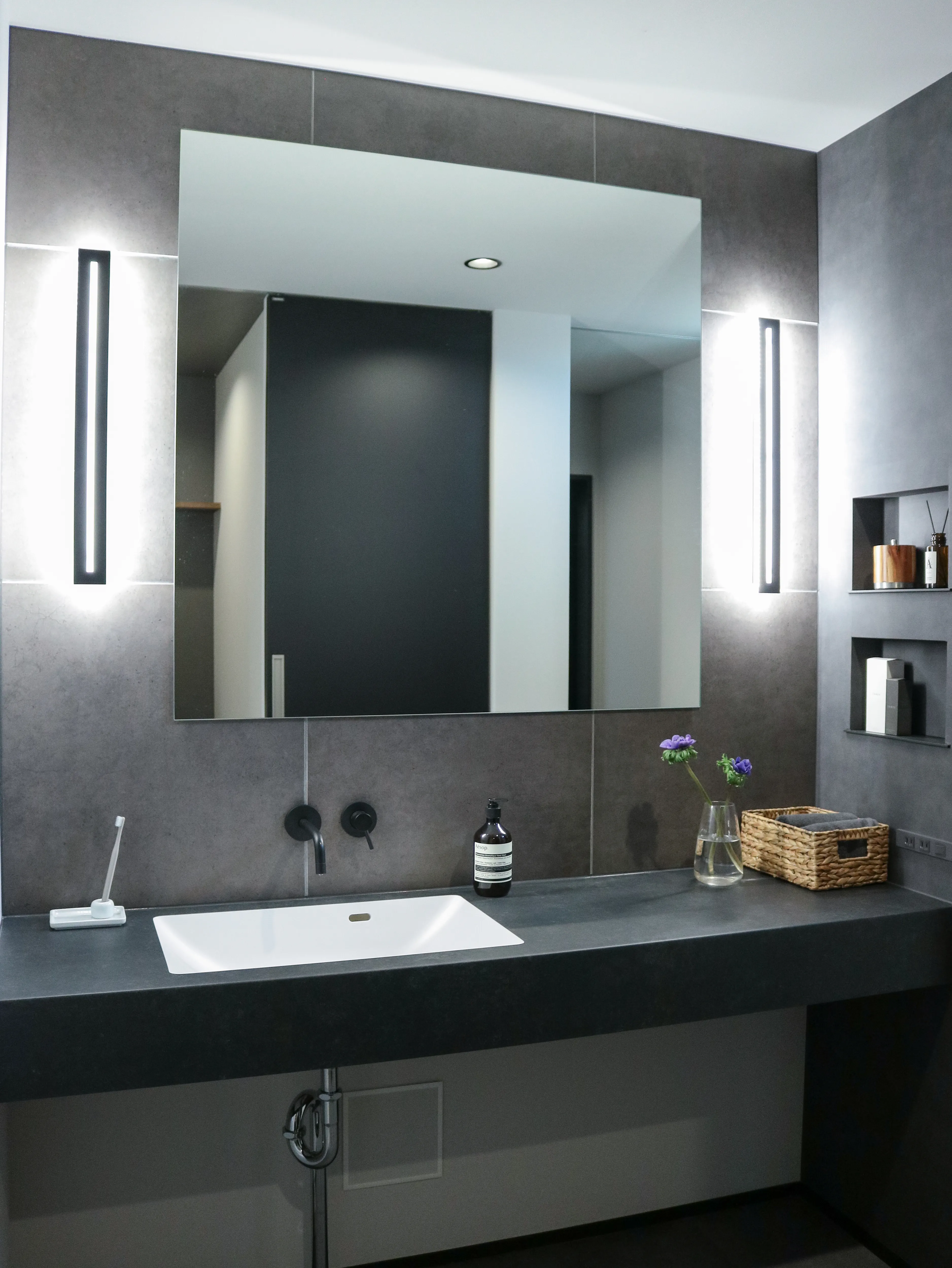 -Lavatory- ダークトーンでまとまられた洗面室。 スタイリッシュな照明がラグジュアリな印象与え、特別感のある雰囲気に。