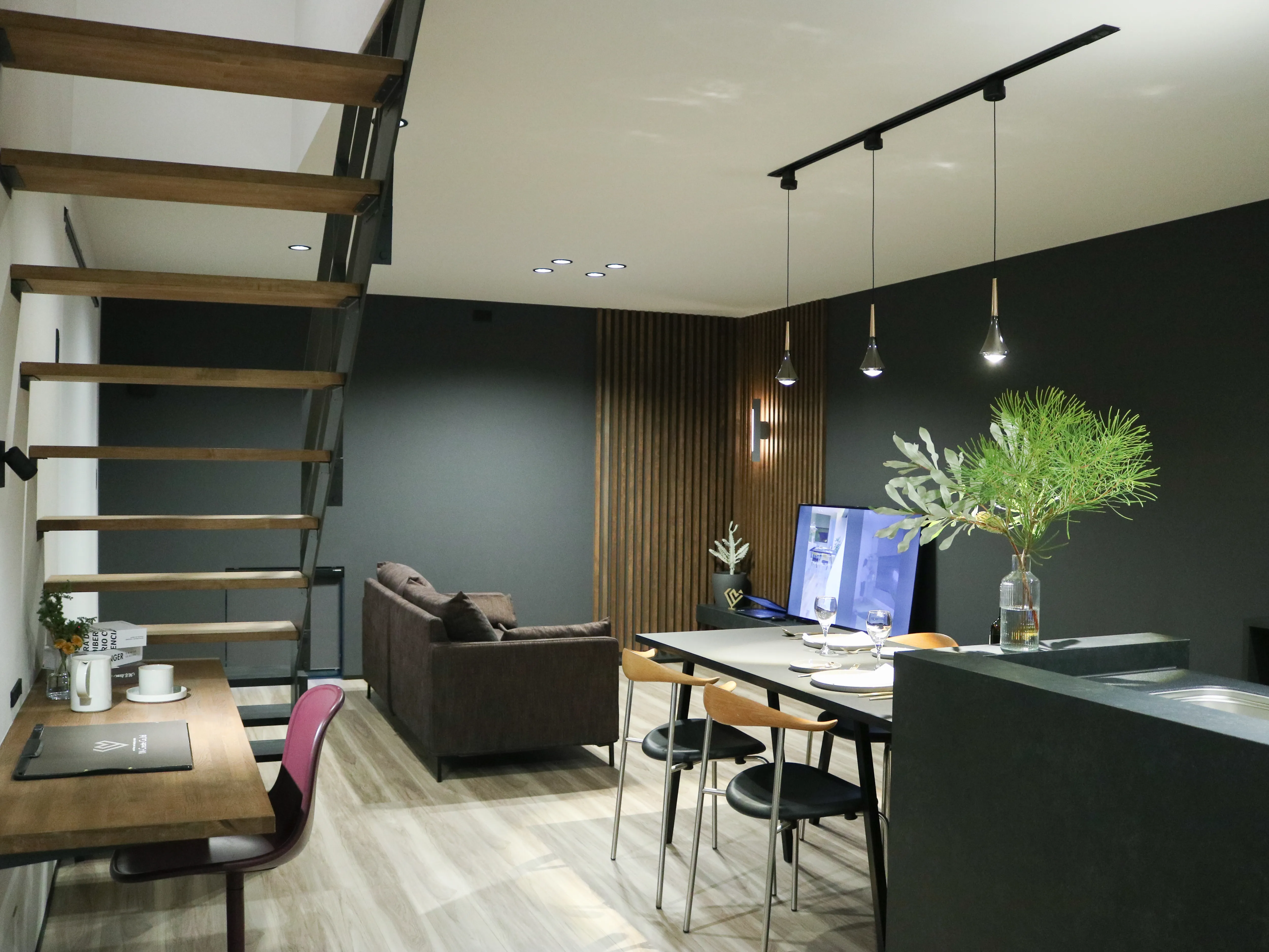 -LDK- 内装をBLACKで統一したことでワンランク上のシックで高級感溢れる空間となりました。 重くなりがちな黒い空間にはスケルトン階段やコーナーに設えた格子で抜け感を演出。