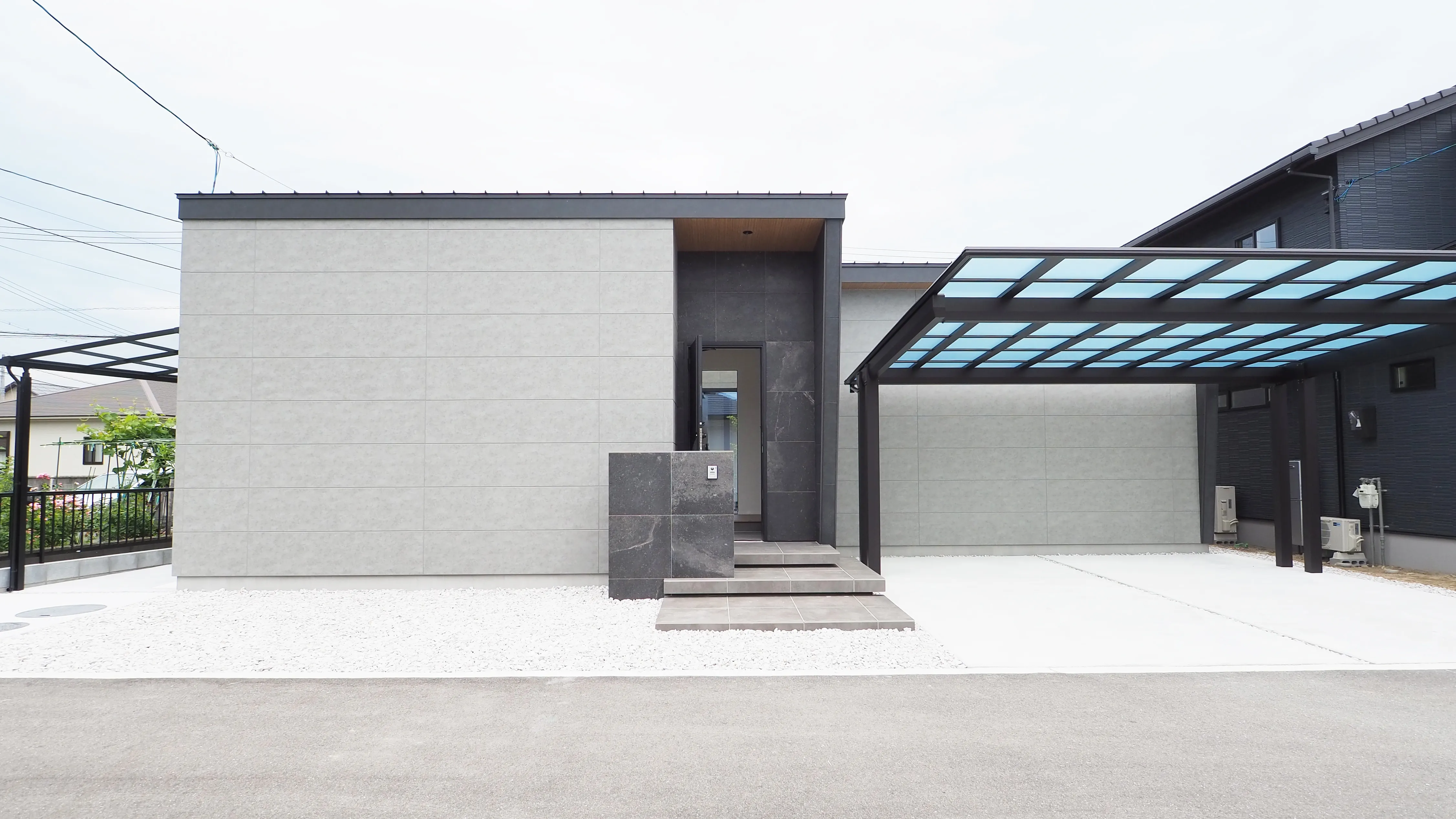 -Exterior- アプローチのフロート階段や、ダイナミックなタイルの大壁。窓のないファサードが印象的なコートハウス。