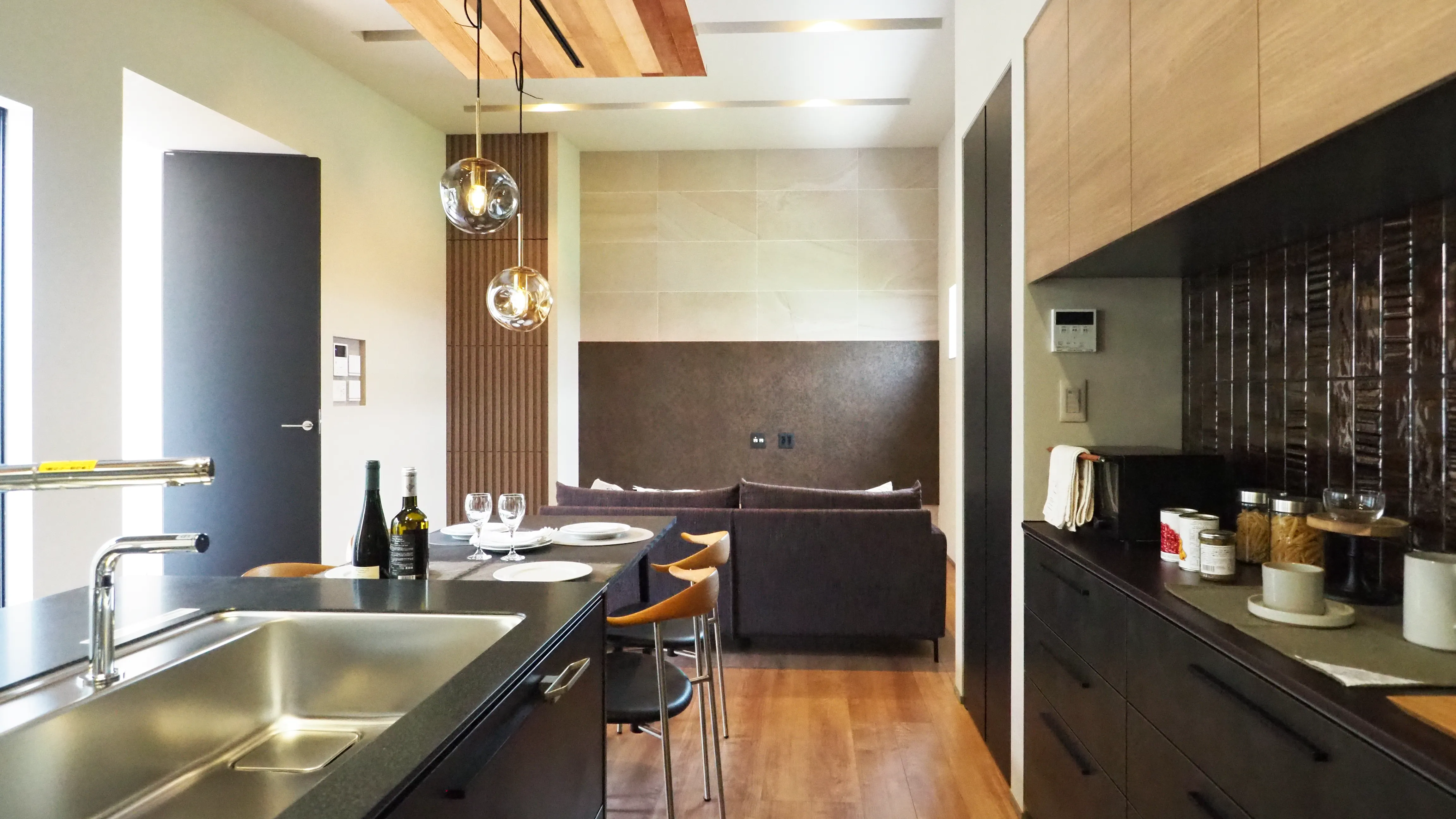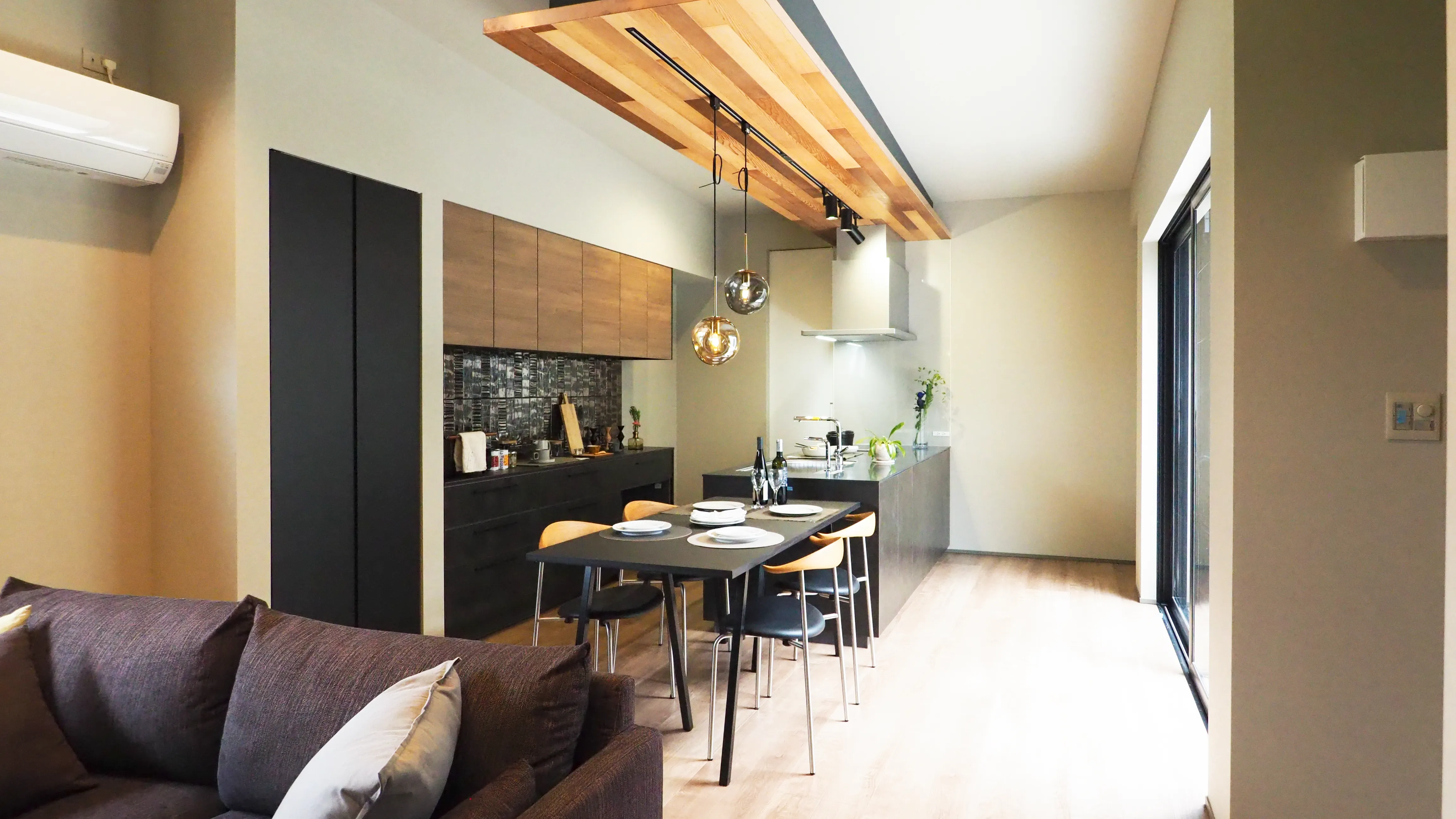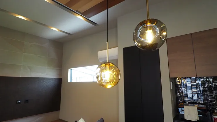 -Kitchen- 勾配天井を活かしながらも、ブロンズとアクセントのペンダントライトで唯一無二の空間にまとめました。