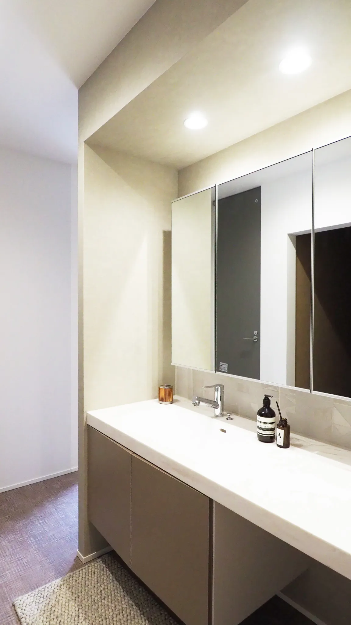 -Washroom- 重厚感のあるタイルを中心にグレージュとホワイトで囲むことで、非日常でスマートなスペースにしました。三面鏡boxと造作収納で収納力ばっちりです。